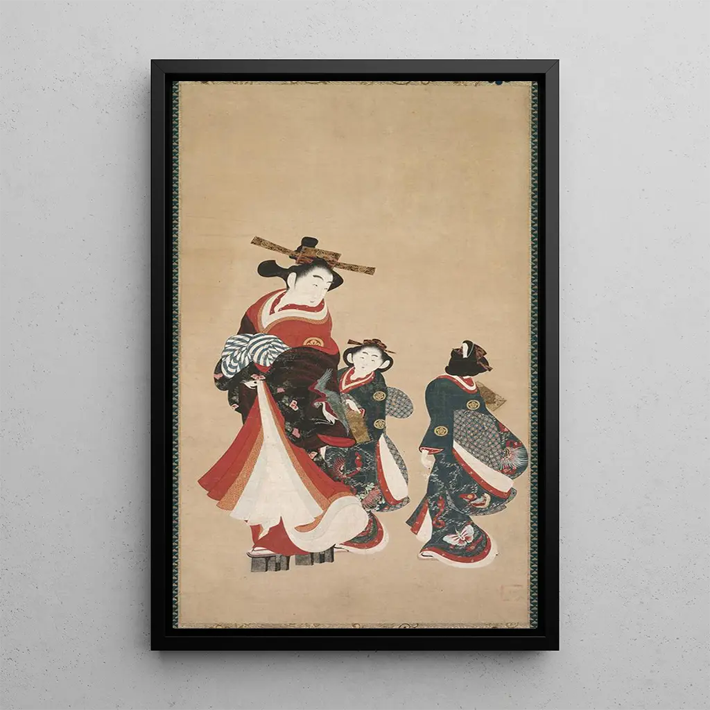 The art print of "Courtisane and Servants" by Engetsud is a piece that immerses the viewer in the intimacy of a moment captured with delicacy. The characters, dressed in colorful kimonos, move gracefully within a richly decorated interior. The shades of red, blue, and gold blend to create a warm and welcoming atmosphere. The technique of silk painting, typical of Japanese art, gives this canvas a unique, almost tactile texture that invites visual exploration of the intricate details of the costumes and accessories.
