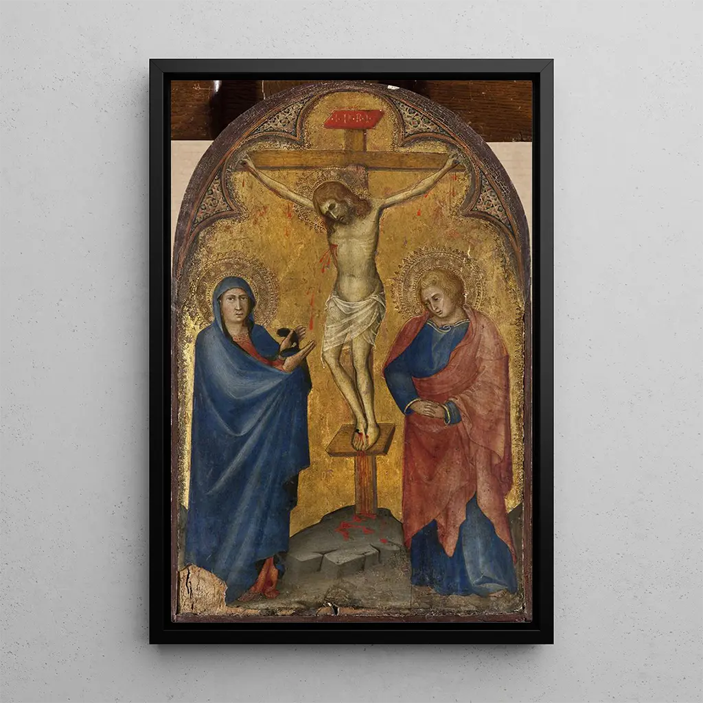 The art print of Andrea di Bartolo's Crucifixion depicts with emotional intensity the tragic scene of Christ's sacrifice. The dark colors and shades of red evoke pain and suffering, while the figures of soldiers and witnesses are rendered with striking realism. The composition is carefully balanced, each element arranged to guide the viewer's gaze toward the center of the artwork, where Christ is suspended on the cross. The atmosphere is heavy with gravity, inviting the viewer to reflect on themes of faith and redemption.