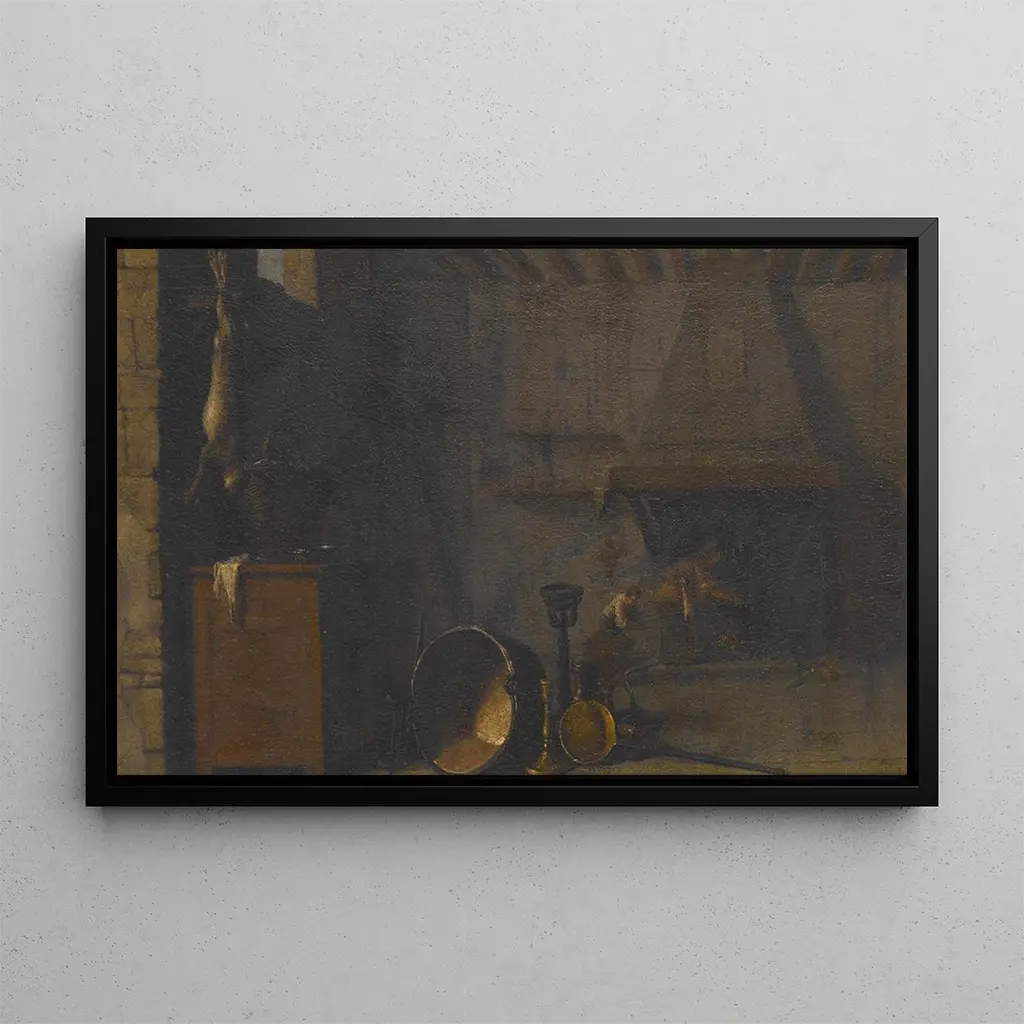 In "Cuisine with Hare," Sébastien Bourdon immerses us in a warm and vibrant atmosphere, where culinary details intertwine with a harmonious composition. The warm tones, ranging from earthy browns to dazzling golds, evoke the richness of ingredients and the art of gastronomy. The light, subtly manipulated, creates soft shadows that add depth to the scene. Every element, from the suspended hare to the pottery, tells a story, inviting the viewer to imagine themselves in this lively kitchen, where the aroma of simmered dishes drifts through the air.