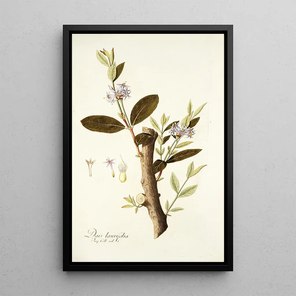 Dais laurifolia, illustrated by Nikolaus Joseph Freiherr von Jacquin, is an art print that celebrates the richness of flora. This reproduction highlights shades of deep green and touches of bright white, evoking the freshness of leaves and the delicacy of flowers. The watercolor technique used by Jacquin captures the lightness and transparency of natural elements, creating a peaceful and contemplative atmosphere. Every detail is carefully observed, inviting a visual exploration of the shapes and textures of this fascinating plant.