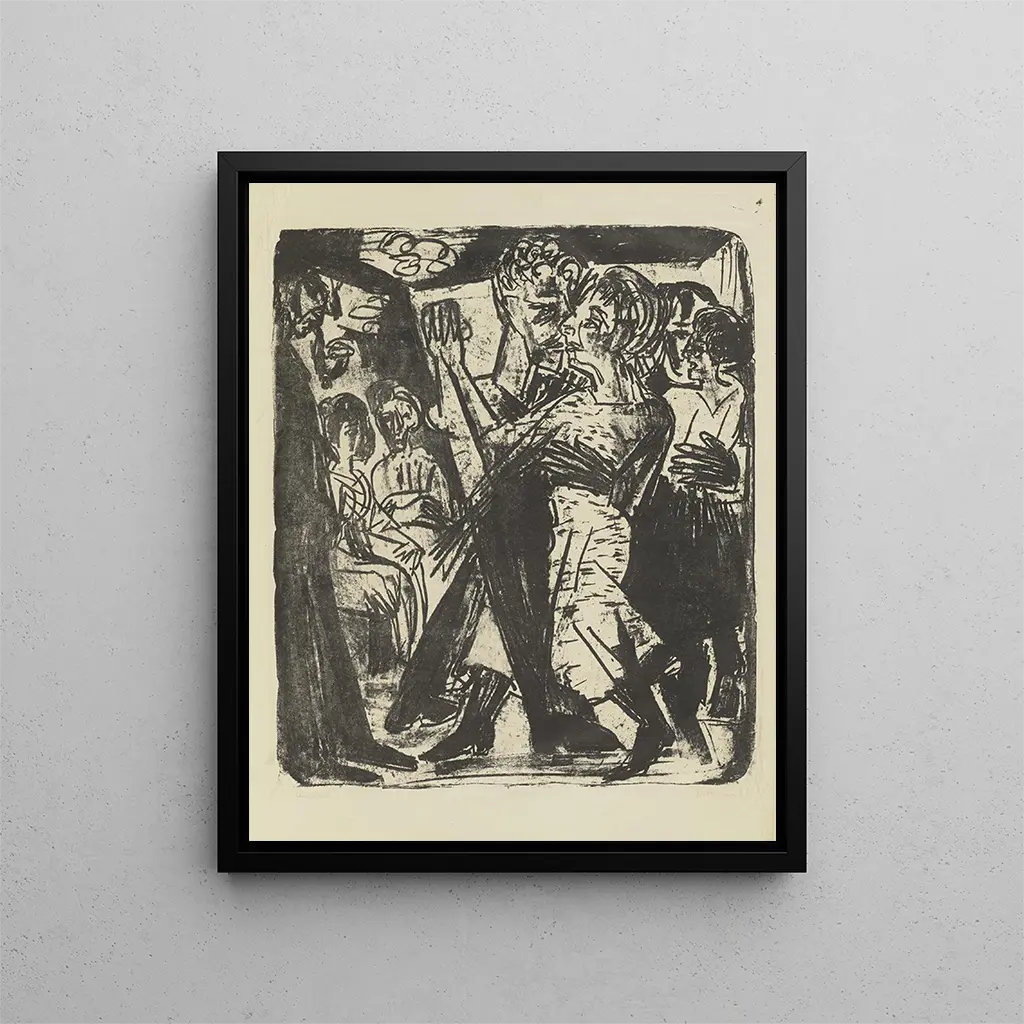 Modern Art print Couple dancing - Ernst Ludwig Kirchner – Captivating introduction The vibrant scene of modern life, captured in all its splendor, emerges powerfully in the artwork "Couple dancing" by Ernst Ludwig Kirchner. This painting, a true ode to expressionism, evokes a lively dance full of passion and movement. Kirchner, a prominent figure of the Die Brücke movement, immerses us in a universe where emotions are intensified by vivid colors and bold shapes. The dynamic between the two characters, who seem to float across the canvas, invites us to feel the energy and lightness of their dance. This piece, through its intensity and modernity, draws the eye and captivates the mind, making each glance a unique experience. Style and uniqueness of the artwork Kirchner's style is distinguished by its bold use of color and its ability to transcend reality. In "Couple dancing," bright hues and expressive outlines blend to create an almost dreamlike atmosphere. The composition, marked by deliberate imbalance, reinforces the idea of movement and freedom. The figures, although stylized, retain a palpable humanity, demonstrating the artist's mastery in capturing the very essence of life. The faces, slightly distorted, express a range of emotions, from euphoria to melancholy, allowing for a personal interpretation of the piece. This singularity makes "Couple dancing" a masterpiece that transcends time and continues to inspire generations of artists and art lovers. The artist and his influence Ernst Ludwig Kirchner, born in 1880 in Germany, is one of the founders of the expressionist movement. His artistic journey is marked by an unceasing quest for new forms of expression, in reaction to the social and cultural upheavals of his time. Kirchner was able to capture the spirit of an era in full transformation, where urbanization and modernity redefined human relationships. His influence extends beyond his contemporaries, touching artists from various movements, from Fauvism to abstract art. His unique vision, which combines a keen sensitivity to human emotions and a