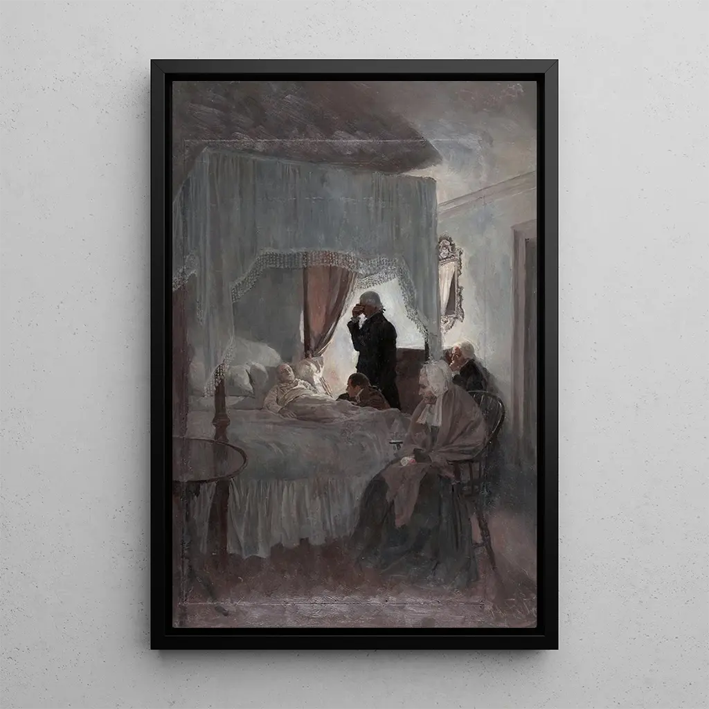 La reproduction "Mort de Washington" de Howard Pyle capture un moment poignant de l'histoire américaine. Dans cette toile, l'artiste dépeint la scène tragique de la mort de George Washington, entouré de ses proches. Les couleurs chaudes et les ombres délicates créent une atmosphère à la fois solennelle et émotive. La composition, centrée sur le visage serein de Washington, évoque une profonde réflexion sur le sacrifice et la dignité. Pyle utilise une technique de peinture à l'huile qui donne vie aux textures des vêtements et à la lumière qui filtre à travers la scène, renforçant l'impact visuel et émotionnel de l'œuvre.