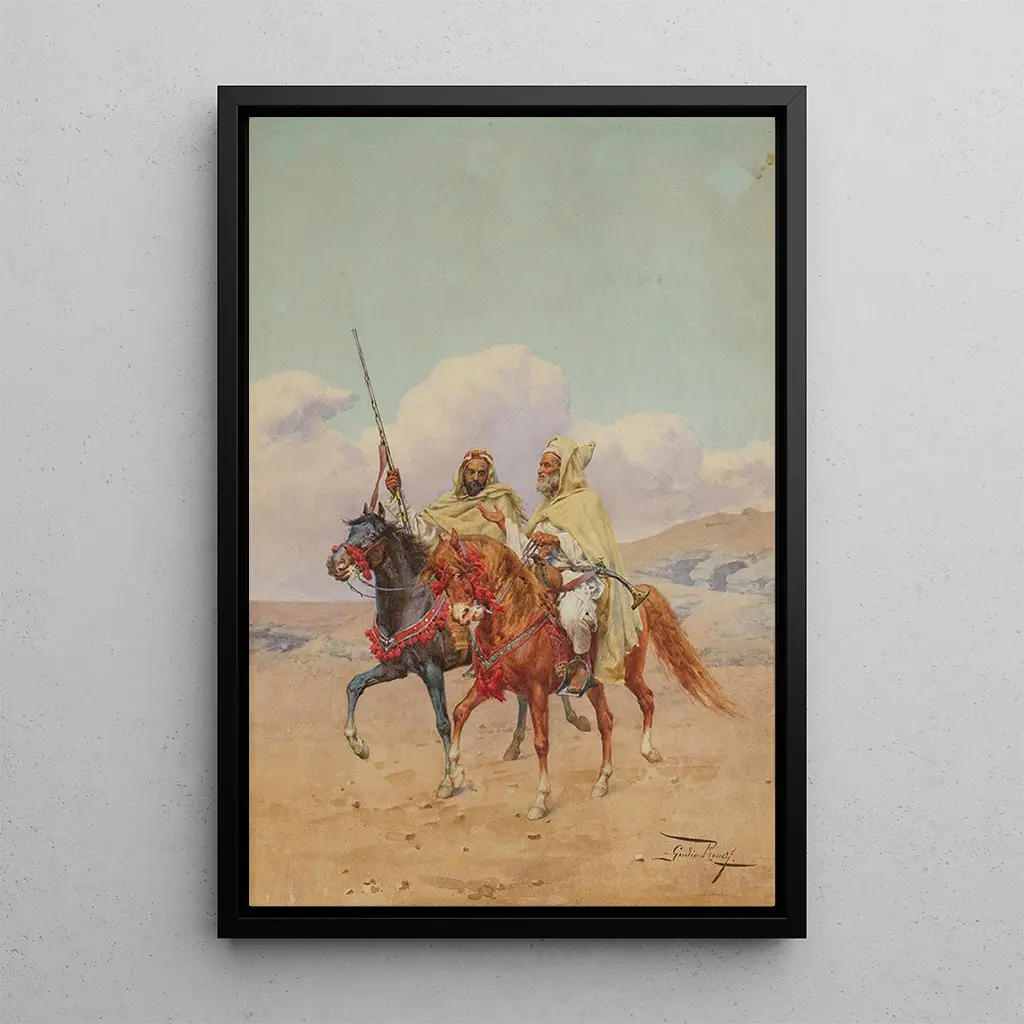 Cavaliers du désert : une épopée sous le soleil brûlant Dans cette œuvre captivante, Giulio Rosati nous transporte au cœur d'un paysage désertique où des cavaliers majestueux avancent avec assurance. Les teintes chaudes de l'ocre et du jaune dominent la toile, évoquant la chaleur intense du soleil. La technique de Rosati, mêlant réalisme et romantisme, crée une atmosphère à la fois dynamique et contemplative. Les détails minutieux des costumes et des montures, associés à un ciel d'un bleu profond, renforcent l'impression de mouvement et d'aventure. Chaque coup de pinceau semble raconter une histoire, celle d'un voyage à travers des contrées lointaines, où l'horizon se perd dans la chaleur du jour. Giulio Rosati : un témoin de l'orientalisme Giulio Rosati, peintre italien du XIXe siècle, est reconnu pour ses œuvres qui illustrent la fascination occidentale pour l'orient. Formé à l'Académie des beaux-arts de Rome, il s'inspire des voyages et des récits d'explorateurs pour créer des scènes empreintes d'exotisme. Son style, ancré dans le mouvement orientaliste, reflète une époque où l'orient était perçu comme un monde mystérieux et enchanteur. Rosati a su capturer l'essence de ces cultures à travers des compositions vibrantes et des personnages expressifs. Son travail, bien que parfois critiqué pour son approche romantique, demeure un témoignage précieux de l'intérêt artistique pour les paysages et les traditions orientales. Une acquisition décorative aux multiples atouts La reproduction de "Cavaliers du désert" est une pièce décorative qui saura enrichir votre intérieur, qu'il s'agisse d'un salon, d'un bureau ou d'une chambre. Sa qualité de reproduction garantit une fidélité remarquable aux détails et aux couleurs de l'œuvre originale, permettant ainsi de profiter pleinement de son attrait esthétique. Ce tableau invite à l'évasion et à la rêverie, apportant une touche d'exotisme à votre décoration. Avec sa composition dynamique et ses teintes chaleureuses, cette toile saura séduire vos invités et créer une ambiance unique dans votre espace de vie.