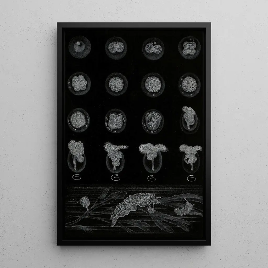 The art print "Developement of a Mollusk" is a decorative piece that will enhance any interior, whether in a living room, office, or bedroom. Its print quality and fidelity to the original details make this canvas an ideal choice for art and nature enthusiasts. The aesthetic appeal of this piece lies in its ability to bring a touch of elegance and serenity to your space. By integrating this art print into your decor, you not only invite the beauty of nature into your home but also foster a conversation about art and science, making each glance a moment of contemplation.