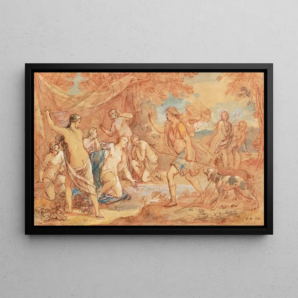 In this art print of Diane and Actéon, Charles-Joseph Natoire captures a moment of dramatic tension between the two mythological characters. The dynamic composition, where the bodies intertwine, is accentuated by a palette of warm colors and shadow play that create an atmosphere that is both sensual and tragic. The meticulous details of the drapery and facial expressions testify to Natoire's talent for bringing life and emotion to painting. Diane's gaze, both surprised and furious, contrasts with Actéon's vulnerable posture, offering a captivating interpretation of this classic myth.