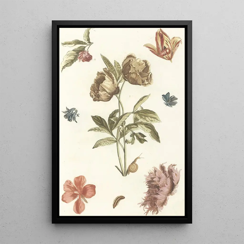 Art print | Different flowers and a caterpillar - Anonymous Source: Reproduction | Différentes fleurs et une chenille - Anonyme