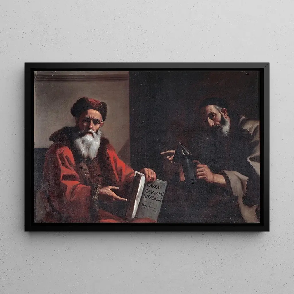 In this captivating art print, Diogenes and Plato meet in an exchange of ideas that transcends time. Mattia Preti, through his rich palette and play of light, manages to capture the intensity of this philosophical dialogue. The warm colors and deep shadows create an atmosphere that is both dramatic and contemplative. The composition, with its imposing figures and carefully crafted background, invites the viewer to reflect on the concepts of truth and wisdom. Every detail, from Diogenes' piercing gaze to Plato's stoic attitude, demonstrates the artist's technical mastery and commitment to representing human thought.