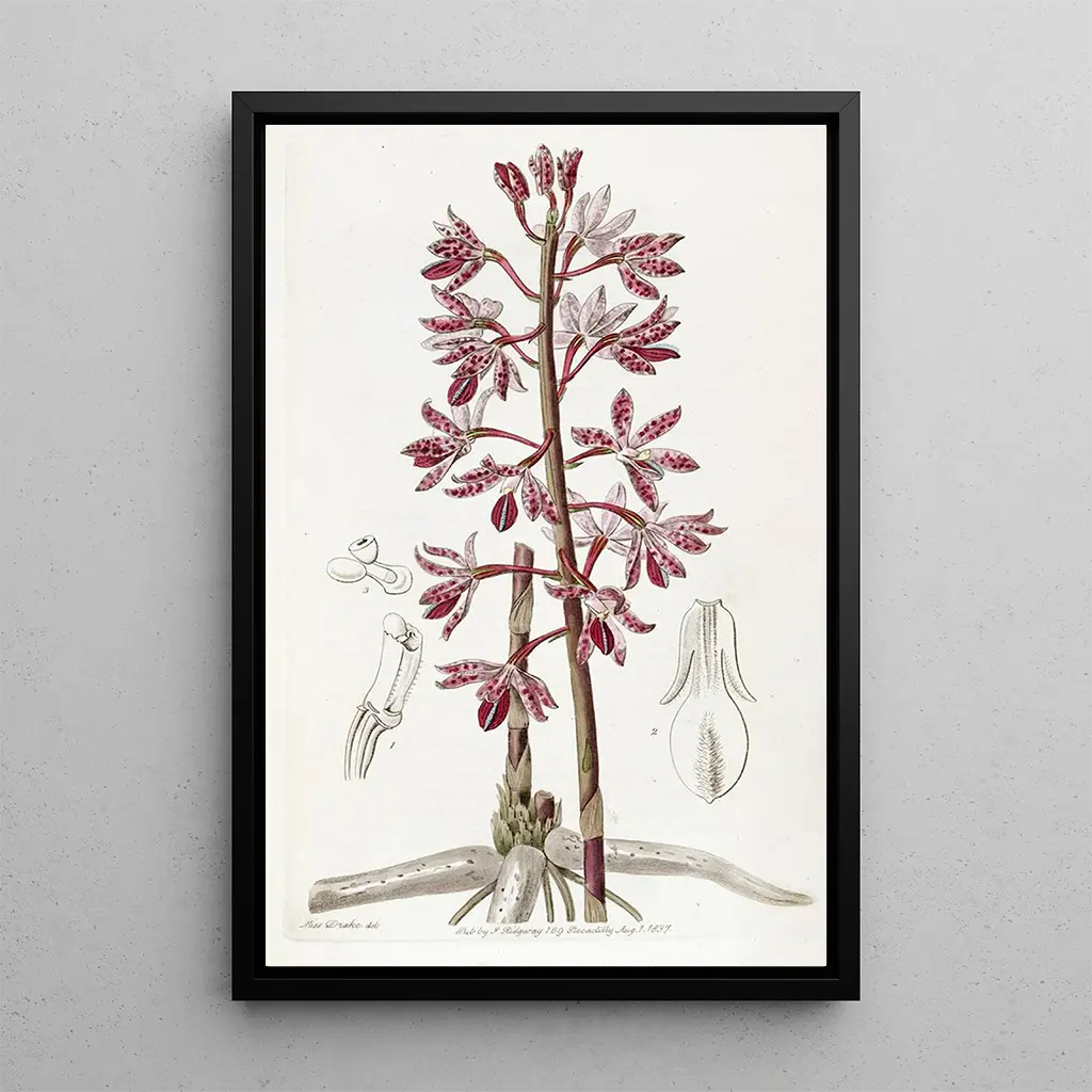 The art print 'Dipodium tacheté' by Sydenham Edwards immerses us in a vibrant floral universe. The striking colors, ranging from violet to white, blend harmoniously, creating an atmosphere that is both delicate and enchanting. The watercolor technique, used with finesse, captures the transparency of the petals and the richness of the details. Each flower seems to come to life, inviting the viewer to get closer and admire the meticulous brushstrokes. This work, both scientific and artistic, transports us to a lush garden where nature expresses itself in all its splendor.