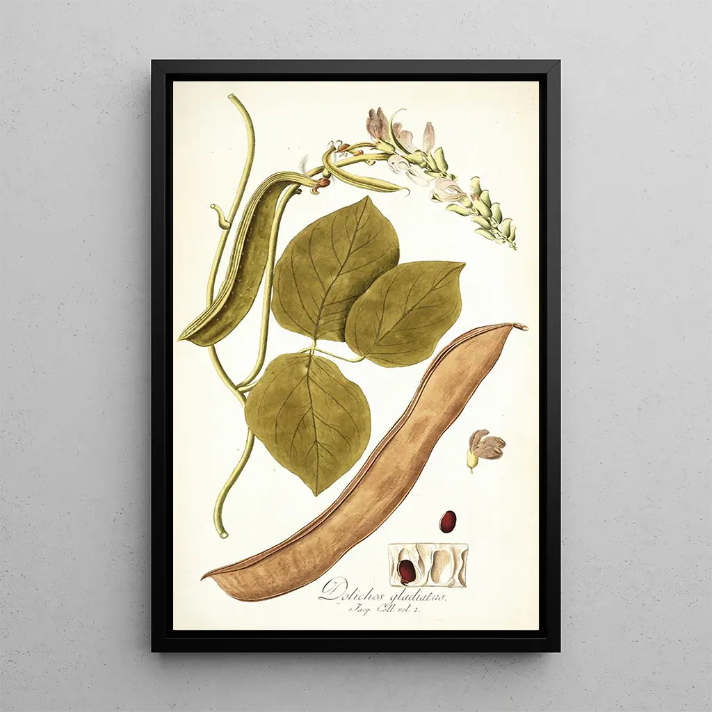Dolichos gladiaius : a celebration of exotic nature The art print of Dolichos gladiaius, a work by Nikolaus Joseph Freiherr von Jacquin, immerses us in a fascinating botanical universe. The canvas stands out with its vibrant colors and meticulous details, capturing the very essence of this climbing plant. The shades of green, purple, and white intertwine harmoniously, creating an atmosphere that is both lively and soothing. The artist's technique, combining precision and poetry, invites us to admire the beauty of nature from a new perspective, as if each leaf and flower told a story. Nikolaus Joseph Freiherr von Jacquin : a pioneer of botanical observation Nikolaus Joseph Freiherr von Jacquin, an 18th-century botanist and artist, played a key role in the study of exotic plants. Originating from Austria, he traveled around the world, collecting specimens and creating illustrations with remarkable accuracy. His work is part of the movement of science and art, where meticulous observation of nature was paramount. Jacquin was influenced by the discoveries of his time, notably botanical explorations, and his legacy endures through his works, which blend science and aesthetics. A decorative piece with multiple assets The art print of Dolichos gladiaius is an ideal decorative item to enhance any space, whether a living room, an office, or a bedroom. Its print quality and fidelity to the details of the original work make it an attractive choice for art and botany enthusiasts. By incorporating this artwork into your decor, you bring a touch of elegance and exoticism, while celebrating the beauty of nature. This art print is not only a decorative element but also a source of inspiration and contemplation in everyday life.