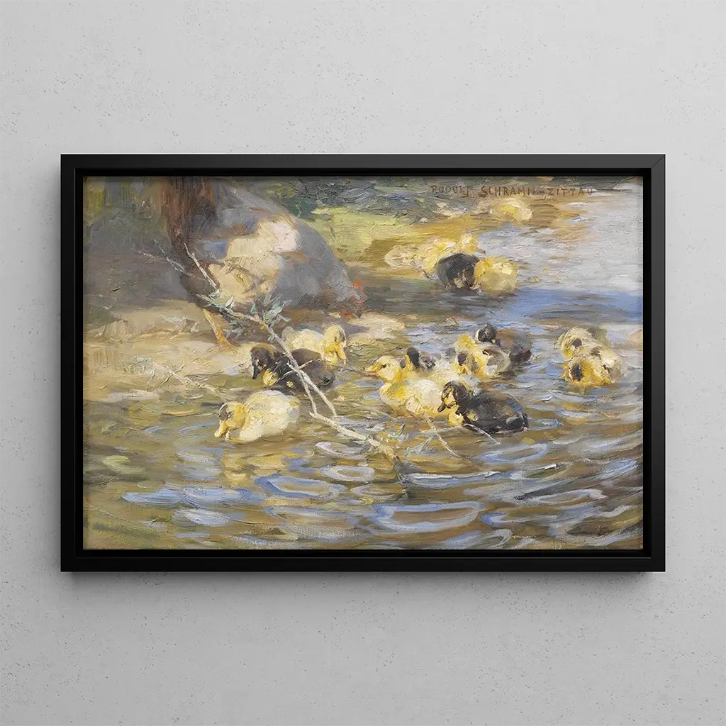 The art print Canards immerses us in a living painting, where nature flourishes under Rudolf Schramm-Zittau's brush. The ducks, depicted in all their splendor, move within a serene aquatic environment, surrounded by lush vegetation. The vivid colors and delicate details capture the essence of wildlife, creating a peaceful and joyful atmosphere. Every brushstroke seems to breathe new life into these birds, inviting the viewer to appreciate the simple beauty of nature.