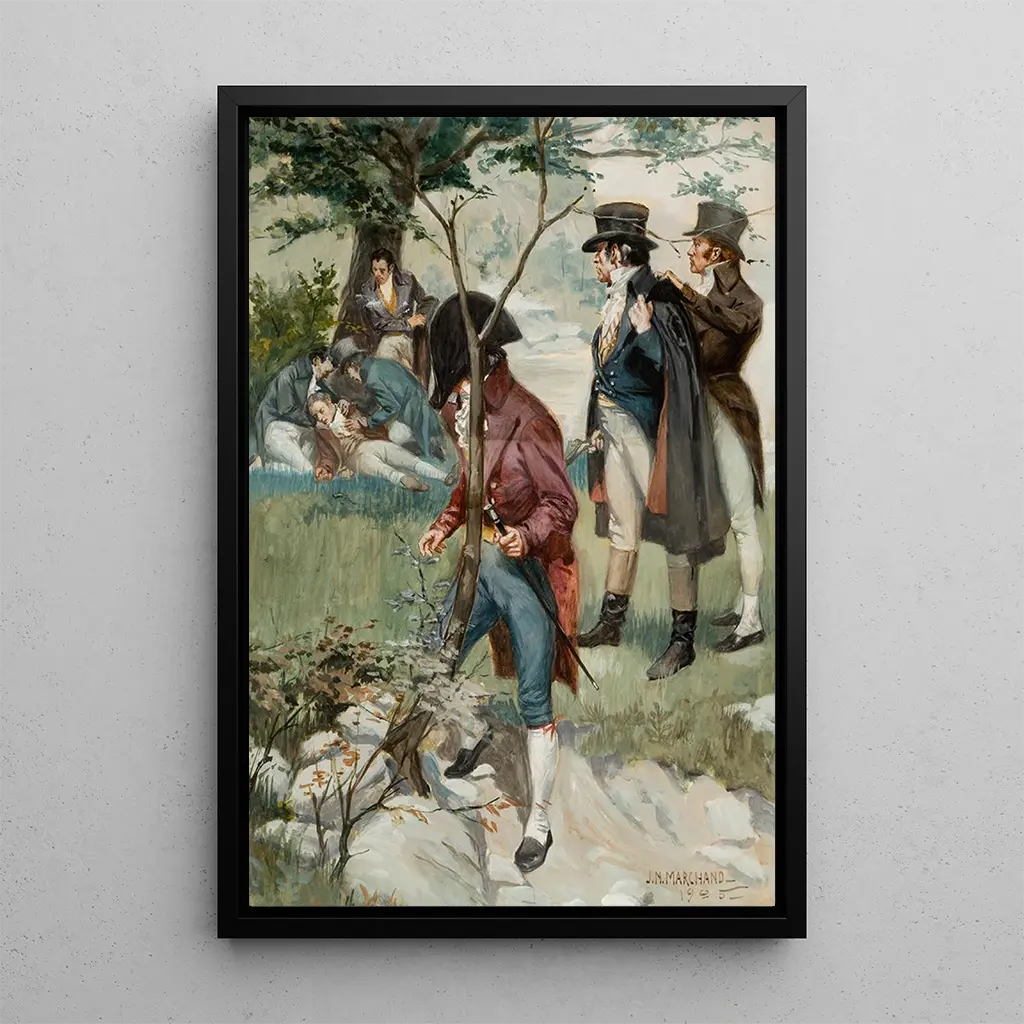 Duels : a dramatic representation of rivalry "Duels" by John Norval Marchand is a work that captures the intensity and tension of a confrontation between two figures. The dynamic composition, with moving characters, evokes a scene of conflict where every detail matters. The vivid colors and striking contrasts enhance the dramatic atmosphere, while the oil painting technique allows for highly precise expressions of the protagonists. This canvas transports the viewer to a key moment, where honor and bravery are put to the test, creating a captivating visual experience. John Norval Marchand : an artist of movement and emotion John Norval Marchand, active in the early 20th century, is known for his works exploring themes of rivalry and conflict. His style, influenced by the Impressionist movement and academic painting techniques, is distinguished by his ability to capture movement and emotion. "Duels" perfectly illustrates his talent for depicting tension-filled scenes, while reflecting an era when duels were perceived as a matter of honor. Marchand established himself as a significant artist, exploring the complexities of human relationships through his art. A decorative acquisition with multiple assets The art print of "Duels" is a bold decorative choice that will add a touch of dynamism to your space. Whether in an office, a living room, or a game room, this canvas immediately draws the eye and sparks interest. Its reproduction quality ensures exceptional fidelity to the details of the original work, allowing full appreciation of Marchand's mastery. With its captivating appearance, this painting becomes a central element of your decoration, enriching your environment with a story of rivalry and bravery that will undoubtedly fascinate your visitors.