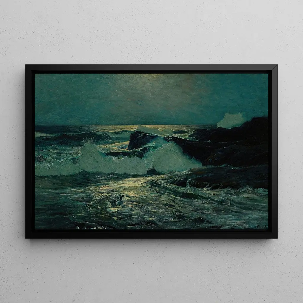 In "Early Moonrise," Frederick Judd Waugh transports us to a world where nature awakens under the gentle reflections of the moon. The composition is dominated by shades of blue and silver, creating a serene and contemplative atmosphere. The waves, delicately stylized, seem to dance under the breath of the wind, while the night sky, sprinkled with stars, envelops the landscape with palpable magic. Waugh's technique, blending watercolor and oil, brings this painting to life, making every detail as lively as a gentle breeze. This artwork invites dreaming, escapism, and contemplation of nature's wonders.