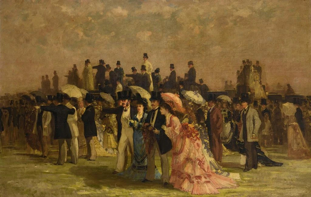 In this vibrant artwork, Louis Abel-Truchet captures the excitement of a race day, where elegant women move gracefully. The shimmering colors and refined details of the dresses evoke an atmosphere of luxury and sophistication. The artist's technique, blending impressionism and realism, brings each character to life, while the blur of the backgrounds suggests movement and the thrill of the event. The faces of the women, though stylized, convey a depth of emotion, inviting the viewer to immerse themselves in this lively scene.