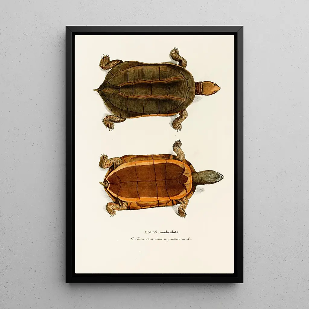 Emys Canaliculata : a tribute to aquatic nature The art print "Emys Canaliculata" by Johann Baptist von Spix is a captivating depiction of the freshwater turtle, capturing the delicate beauty of this animal in its natural habitat. The vibrant colors and meticulous details of the shell, as well as the water's texture, create an atmosphere of serenity and wonder. The watercolor technique, used with finesse, allows for the rendering of reflections and light nuances, bringing this peaceful scene to life. Each brushstroke seems to tell a story, inviting the viewer to dive into the aquatic universe and appreciate the richness of biodiversity. Johann Baptist von Spix: a pioneer of naturalist observation Johann Baptist von Spix, a 19th-century naturalist and explorer, played a crucial role in the study of Brazilian fauna and flora. His work, often associated with the rise of modern science, helped document many species still unknown at the time. Influenced by the currents of Romanticism and empirical science, he knew how to combine art and scientific observation. "Emys Canaliculata" fits into this tradition, demonstrating his commitment to capturing the beauty of nature while contributing to scientific knowledge. His legacy endures, inspiring many artists and scientists around the world. A decorative acquisition with multiple advantages The art print of "Emys Canaliculata" is an ideal decorative piece to enhance your interior, whether in a living room, office, or bedroom. Its print quality and fidelity to the details of the original artwork make it an attractive choice for art and nature enthusiasts. This artwork adds a touch of elegance and serenity to your space, while sparking conversations about biodiversity and the beauty of the natural world. By choosing this canvas, you opt for a decoration that is both aesthetic and meaningful, capable of captivating all eyes.