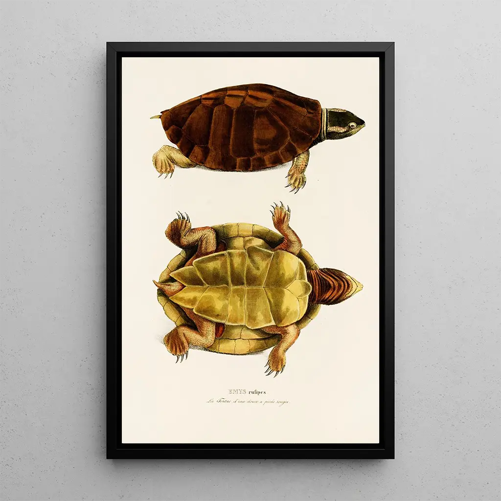 The art print of "Emys Rufipes" makes an ideal decorative addition to various spaces, whether a living room, office, or bedroom. Its printing quality ensures remarkable fidelity to the details of the original artwork, while adding a touch of freshness and serenity to your interior. This art print, with its undeniable aesthetic appeal, will attract art and nature enthusiasts alike. By choosing this canvas, you opt for a piece that not only enhances your space but also encourages reflection on biodiversity and the importance of conservation.