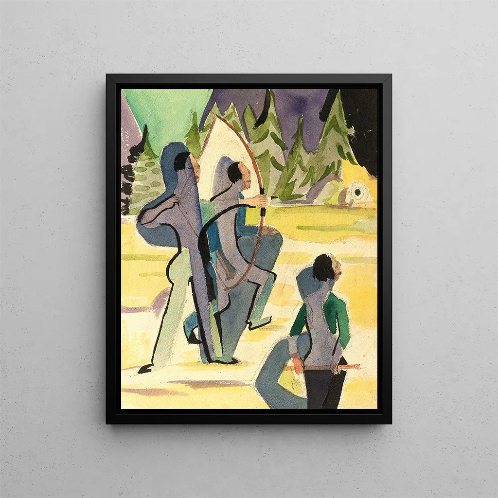 In the work titled Archer, Ernst Ludwig Kirchner captures the very essence of movement and concentration. This painting, rich in dynamic colors and stylized forms, evokes the power and grace of the central figure. Kirchner's bold technique, blending quick brushstrokes and vibrant nuances, creates an almost tangible atmosphere, where energy seems to emanate from the canvas. The Archer thus becomes a metaphor for human struggle, between physical strength and inner mastery, inviting the viewer to feel this duality.