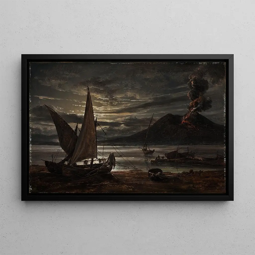 The art print of "Eruption of Vesuvius by Moonlight" is a decorative piece that will enhance your interior, whether it is a living room, an office, or a bedroom. Its faithful print quality and aesthetic appeal make it an ideal choice for those who wish to add a touch of elegance and character to their space. This painting, with its dramatic and poetic atmosphere, sparks curiosity and conversations, while offering a window into the wild beauty of nature. Choosing this canvas is choosing to invite art and passion into your daily life.