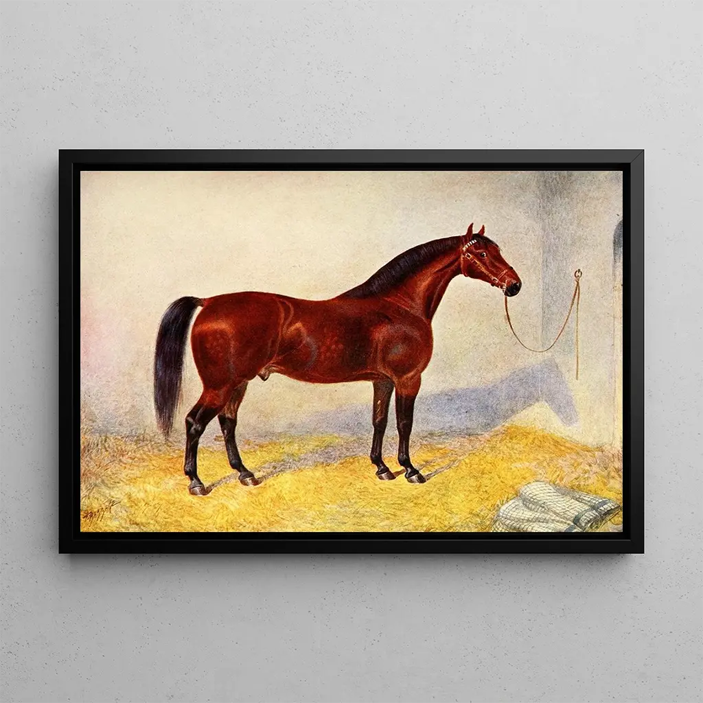The artwork "Stallion Cleveland Bay Sultan" by Frank Babbage depicts an equestrian scene imbued with nobility. The canvas, rich in detail, highlights the power and grace of this horse, whose shiny coat captures the light brilliantly. The warm, earthy colors evoke a pastoral landscape, while Babbage's technique, blending realism and romanticism, gives the animal an almost lifelike atmosphere. The background, subtly blurred, focuses attention on the main subject, creating an invitation to admire the natural beauty of this stallion.