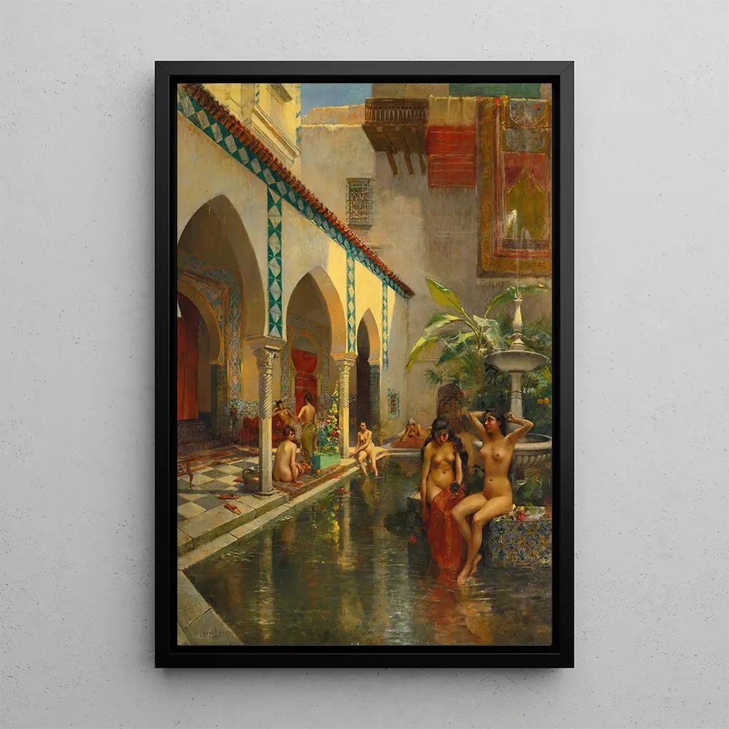 An Exotic Courtyard: An Escape to Distant Horizons The art print "An Exotic Courtyard" by Henri Victor Lesur transports us into a vibrant world of colors and light. This canvas, rich in detail, depicts a scene of everyday life in a lush setting, where nature harmoniously intertwines with architecture. Lesur uses a palette of warm colors, evoking the heat of a tropical climate, while the interplay of shadow and light creates an almost magical atmosphere. The characters, though discreet, add a human dimension to this composition, inviting the viewer to imagine themselves in this peaceful courtyard, far from the turmoil of the modern world. Henri Victor Lesur: a painter at the heart of Impressionism Henri Victor Lesur, active at the end of the 19th century, is often associated with the Impressionist movement, although he developed a style that is uniquely his own. Influenced by the landscapes and light of his travels, Lesur was able to capture the essence of his subjects with a unique sensitivity. His career was marked by a constant exploration of exotic themes, reflecting an era when Orientalism fascinated European artists. Through his works, he contributed to enriching French artistic heritage, while offering a new perspective on distant cultures. A decorative acquisition with multiple assets The art print of "An Exotic Courtyard" is an ideal choice to enhance your interior, whether in a living room, office, or bedroom. Its printing quality guarantees remarkable fidelity to the colors and details of the original artwork, allowing you to fully enjoy the beauty of this scene. By integrating this canvas into your decor, you bring a touch of elegance and escape, while sparking the curiosity of your guests. This painting, a true invitation to travel, will enrich your living space with a warm and welcoming atmosphere.