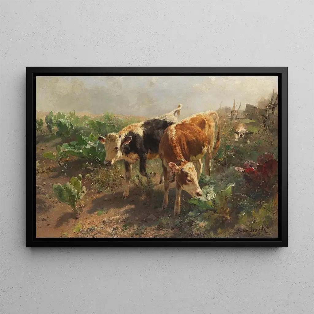 Anton Braith's artwork Expulsion du champ de gemses depicts a striking scene where dramatic tension is palpable. The dark colors and striking contrasts create an atmosphere of urgency and conflict. Braith's technique, which uses bold brushstrokes and a dynamic composition, immediately draws the eye to the action-packed characters. Every detail, from facial expressions to postures, helps tell a poignant story, immersing the viewer in a moment of struggle and determination. This art print invites us to reflect on themes of exile and resistance.