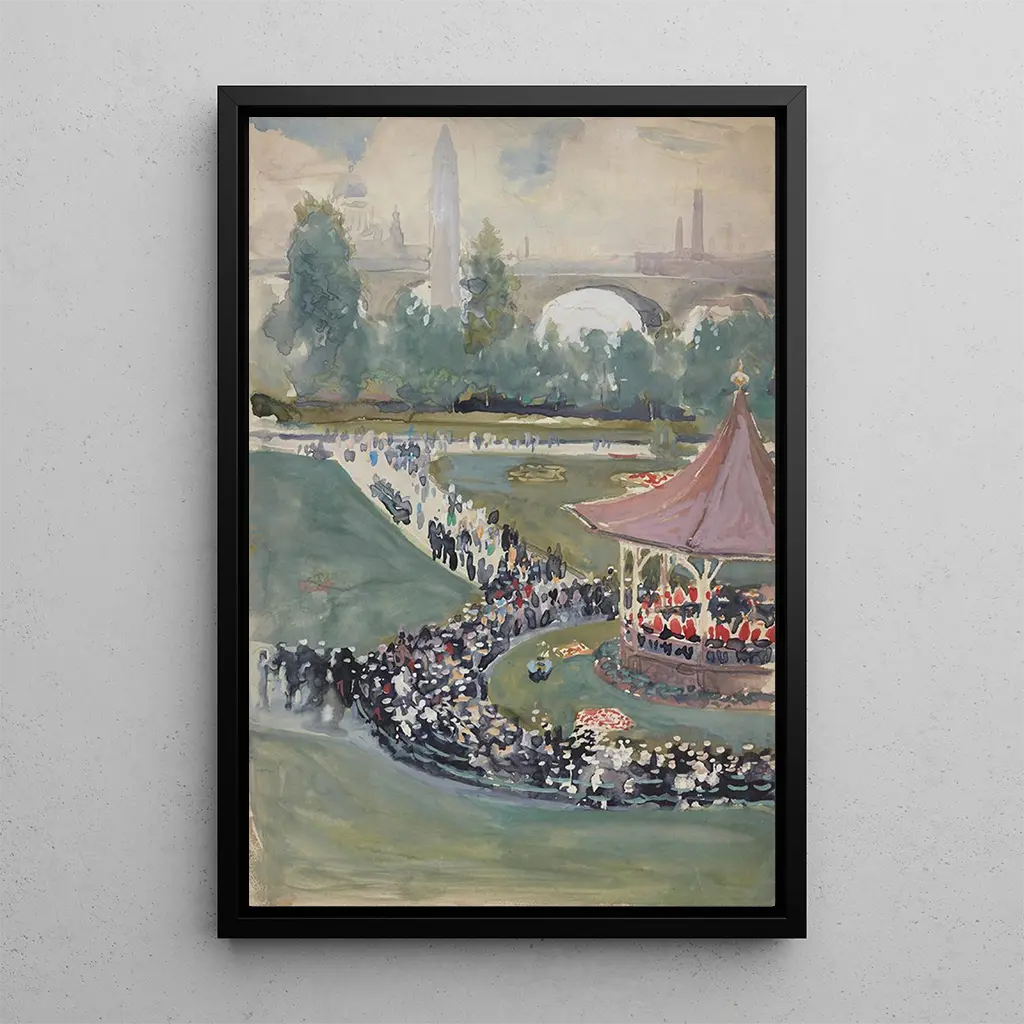 The art print "Fanfare concert" by Joseph Pennell captures the vibrancy of a festive moment, where music and conviviality come together. The dynamic composition depicts musicians in action, surrounded by an captivated audience, in a bucolic setting. The vivid colors and expressive brushstrokes evoke a joyful and lively atmosphere, transporting the viewer to the heart of this animated scene. Pennell, with his distinctive style, succeeds in conveying the energy and passion of music, making this piece a true ode to popular culture.