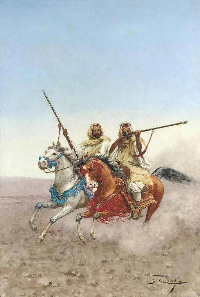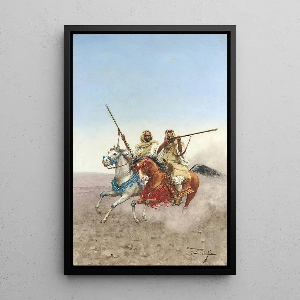 Giulio Rosati, an Italian painter of the 19th century, is best known for his Orientalist art prints that capture the beauty and exoticism of Eastern cultures. His career was marked by a series of travels that profoundly influenced his art. Rosati skillfully integrated elements of Arab and North African cultures into his compositions, while maintaining a refined technical approach. His style, characterized by vibrant colors and meticulous details, made him an emblematic representative of Orientalism, an artistic movement that fascinated Europe at the time.