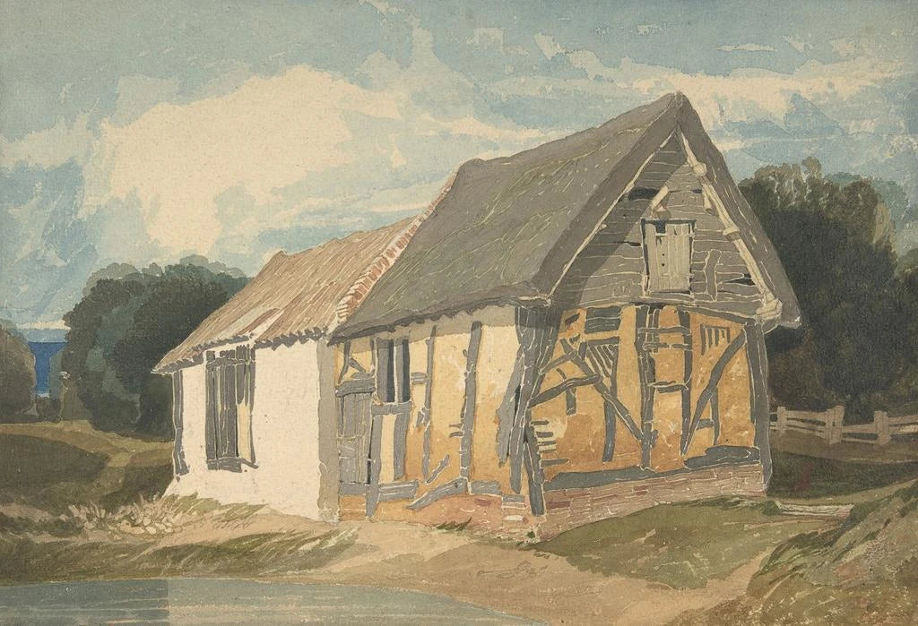 This artwork by John Sell Cotman, titled "Farm building near a pond," evokes bucolic serenity where architecture gently blends into the landscape. The soft, pastel colors, typical of watercolor, create a calming atmosphere, while the reflections in the pond add a poetic dimension to the scene. Cotman, a master of light, plays with shades to bring this farm to life, where every detail, from the roof to the surrounding trees, seems to breathe tranquility. The piece invites silent contemplation, a moment suspended between sky and earth.