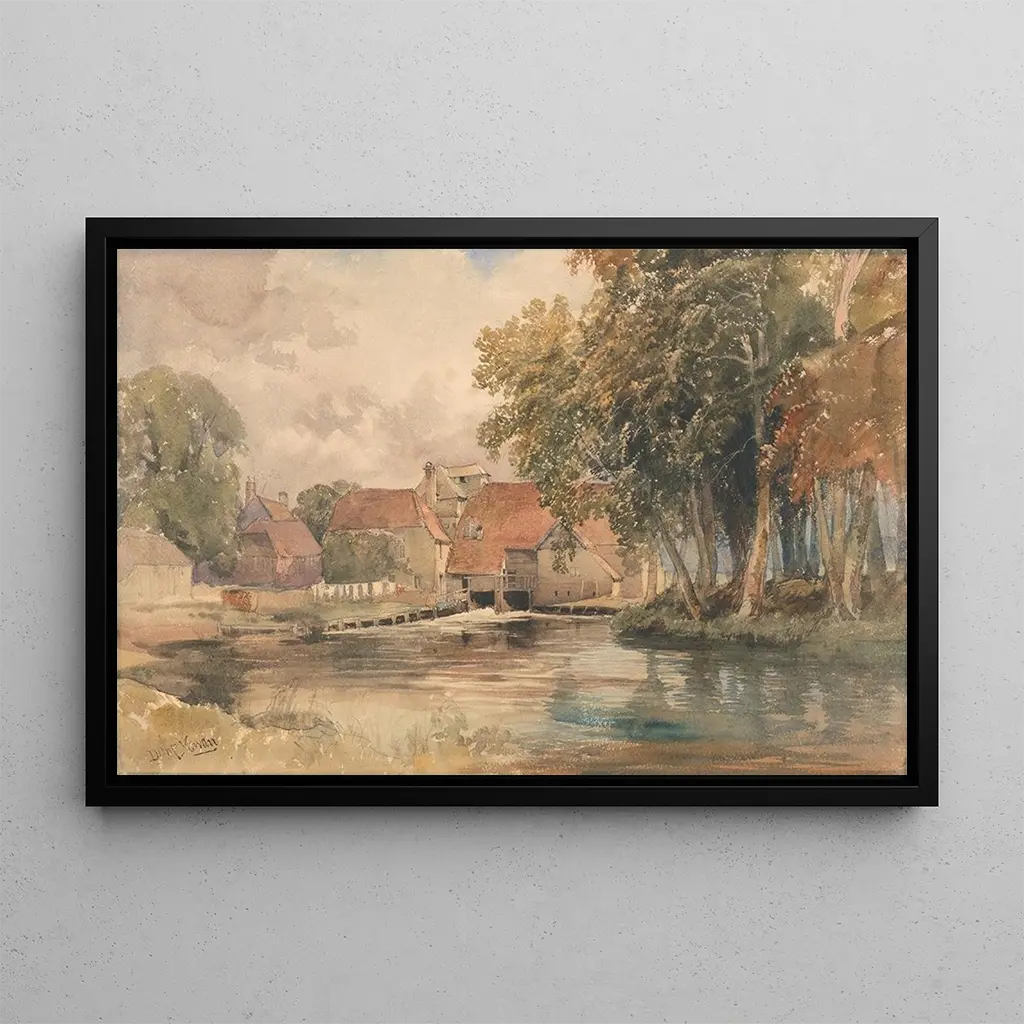 The art print "Farm on the River" by David Hall McKewan evokes a peaceful scene where nature and architecture meet harmoniously. The soft colors and shades of green and blue create a calming atmosphere, while the light plays on the water, adding an almost magical dimension to the whole. McKewan's technique, characterized by delicate brushstrokes, brings this farm to life, appearing to flourish at the edge of the river. Every detail, from majestic trees to reflections in the water, invites contemplation and escape.