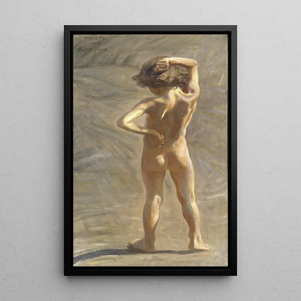 Discover the exquisite art print Étude d'un garçon nu by Fausto, a captivating exploration of youth and vulnerability. This reproduction captures the ephemeral beauty of adolescence through a delicate and emotive composition. Soft colors and nuanced flesh tones intertwine to create an intimate atmosphere, where light plays across the model's skin, emphasizing its fragility. The artist's technique, blending realism and impressionism, allows you to feel the tenderness of the moment, like a visual caress. Every detail, from the boy's contemplative gaze to the folds of his body, evokes a sense of tranquility and reflection, inviting viewers to ponder innocence and the beauty of childhood.
