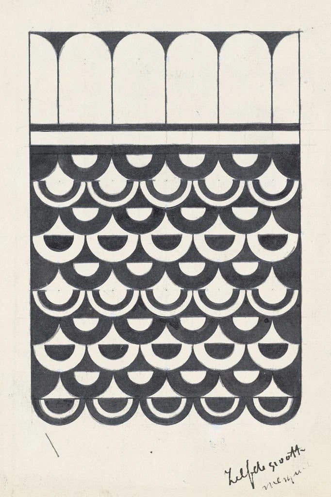 The scale ornament by Samuel Jessurun de Mesquita is a work that evokes the organic beauty of nature through stylized motifs. The scales, delicately depicted, seem to vibrate with life and movement, creating a captivating dynamic. The color palette, subtly nuanced, suggests natural shades reminiscent of the reflections of light on water. The engraving technique, characteristic of the artist, allows play with shadows and highlights, adding visual depth to this composition. Each element of the artwork appears to interact, forming a harmonious whole that invites contemplation.