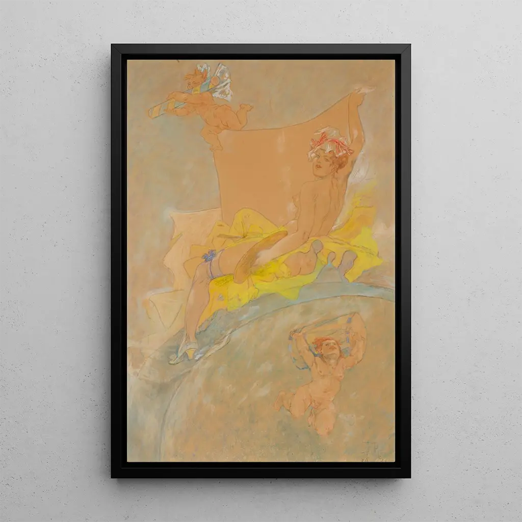 This art print of Félicien Rops's Project d'affiche immerses us in a captivating visual universe. The vibrant colors and bold lines intertwine to create a dynamic composition that immediately captures the eye. Rops, master of the art print, employs innovative printing techniques for his time, blending lithography and drawing. The atmosphere emanating from this work is both joyful and provocative, reflecting the free and avant-garde spirit of the late 19th century. Every detail of this canvas testifies to the artist's passion for beauty and aesthetics, inviting the viewer to immerse themselves in his world.