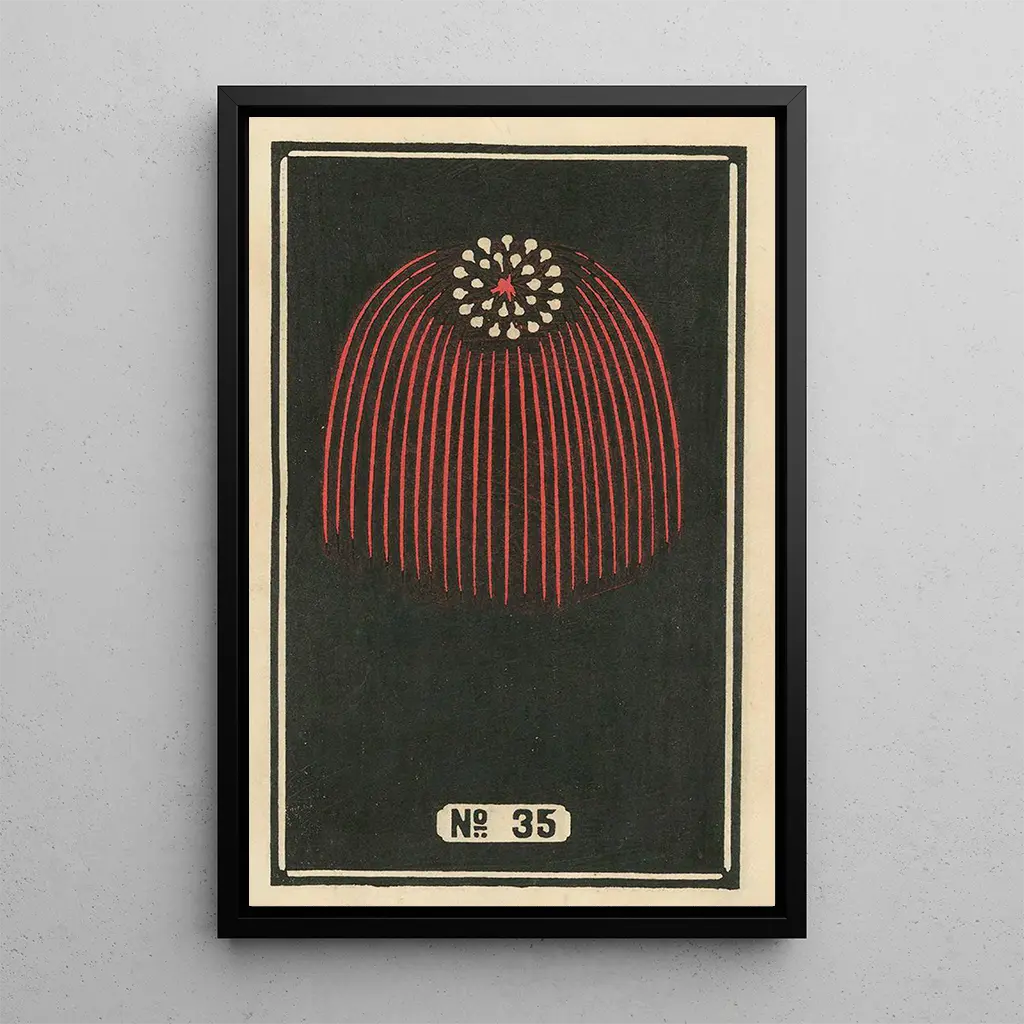 "Night Fireworks Art Print No. 35" by Jinta Hirayama is a captivating piece that evokes the magic of a night illuminated by bursts of light. The vibrant colors and dynamic shapes intertwine, creating a visual spectacle that immediately captures the eye. The artist's technique, which employs fluid brushstrokes and subtle gradients, conveys a sense of movement and vitality. This canvas invites the viewer to feel the excitement and fleeting beauty of fireworks, transforming a simple night into a memorable event.