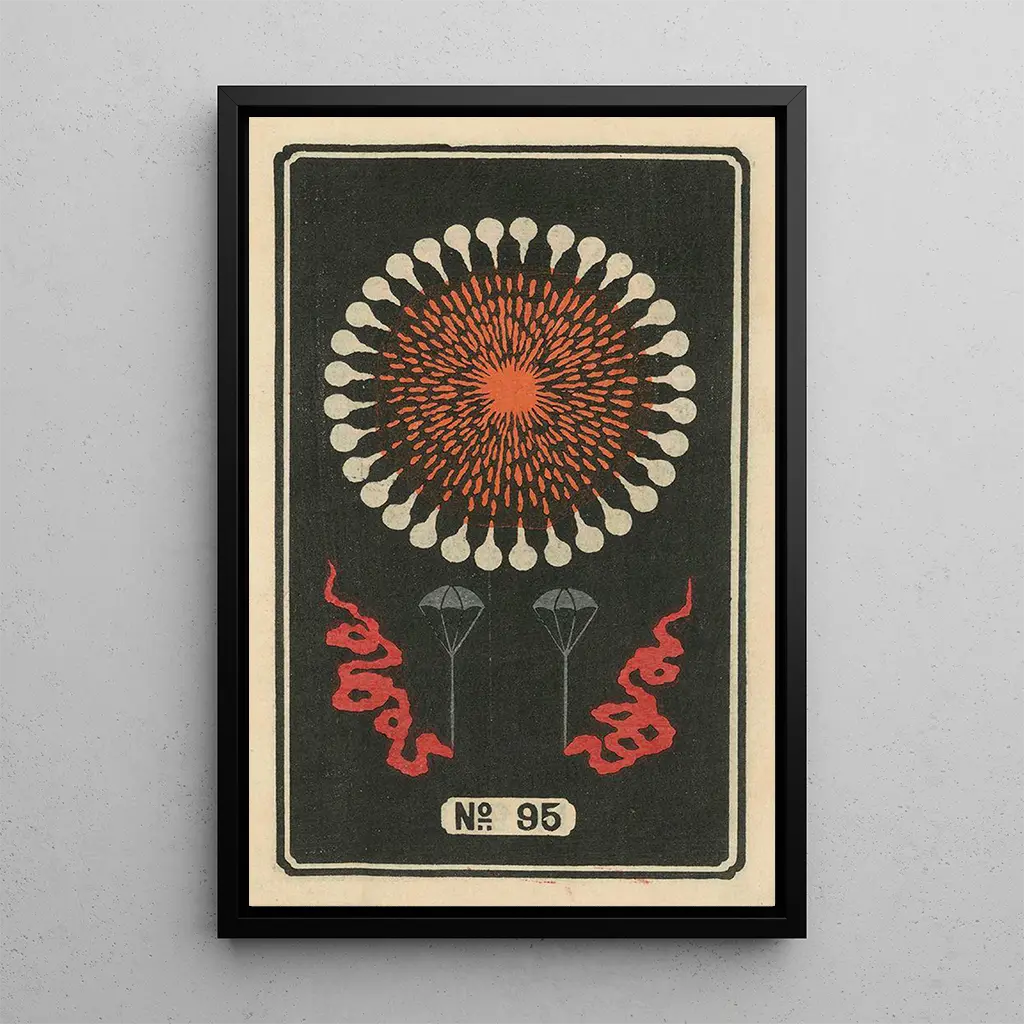 The "Nocturnal Fireworks No. 95" by Jinta Hirayama offer a spectacular vision of a night illuminated by explosions of color. This art print, vibrant and dynamic, evokes the magic of nocturnal celebrations, where each burst of light seems to tell a story. The vivid hues and striking contrasts create a festive atmosphere, inviting the viewer to immerse themselves in a dreamlike universe. The artist's technique, which skillfully blends tradition and modernity, brings this scene to life, transforming the canvas into a true visual spectacle.