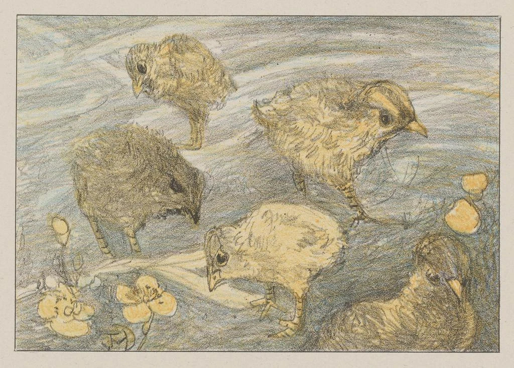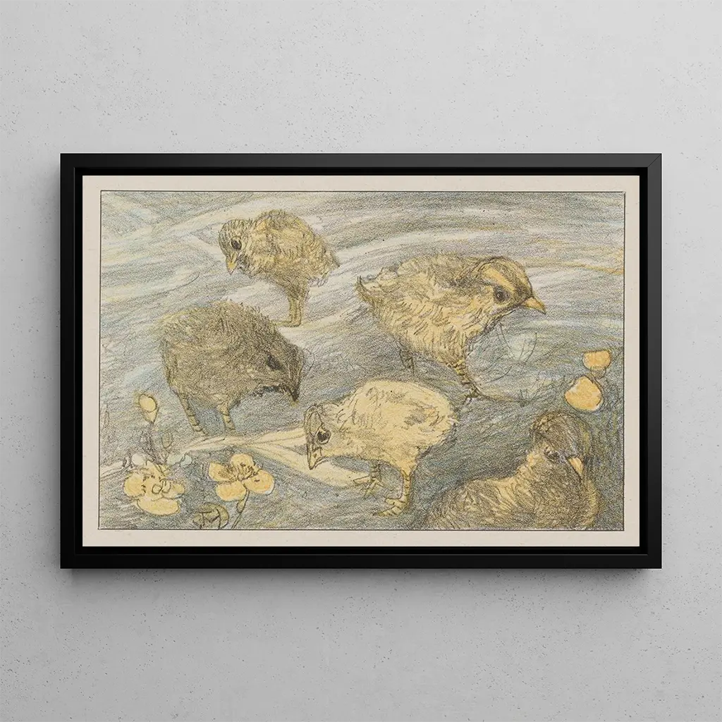 In this delicate artwork, Theo van Hoytema captures the innocence and curiosity of young chicks. The composition, subtly balanced, highlights the small creatures with fluffy feathers, bathed in soft and warm light. The pastel shades, ranging from pale yellow to beige, create a calming, almost dreamlike atmosphere. The watercolor technique, used with finesse, renders the delicate textures of the feathers and earth, while infusing a vibrant life into these little beings. This art print of "Five Chicks" invites serene contemplation, evoking the simple beauty of nature.