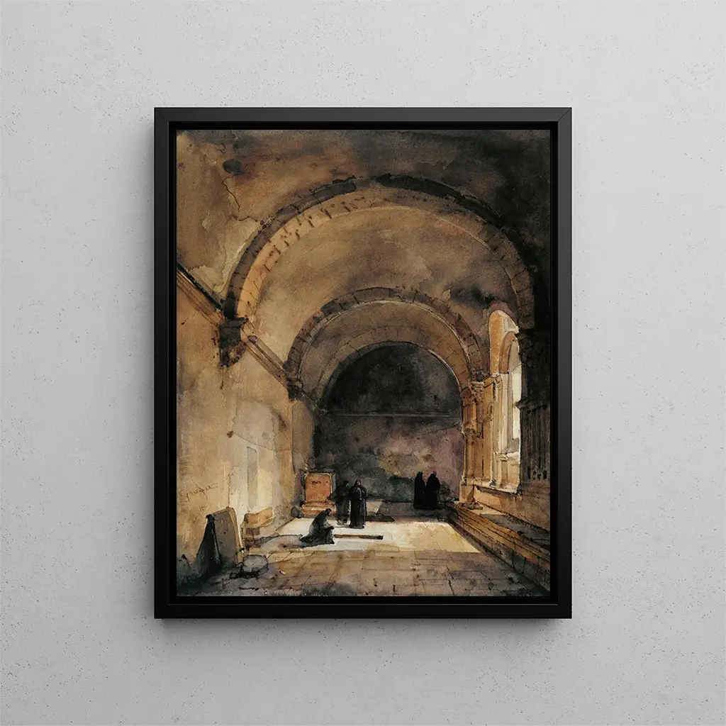 Granets's style is distinguished by its ability to blend realism with a certain abstraction of forms. In "Five figures under a vault," each figure is rendered with remarkable detail, while the background, though detailed, leaves room for interpretation. The vault, majestic and imposing, becomes the symbol of a space where time seems suspended, creating a striking contrast between the solidity of the architecture and the fragility of the human beings inhabiting it. The colors chosen by Granet, soft and harmonious, evoke an atmosphere of calm and contemplation, reinforcing the idea that this work is much more than a simple depiction of characters. It aims to be a reflection on the human condition, interpersonal relationships, and the passage of time.