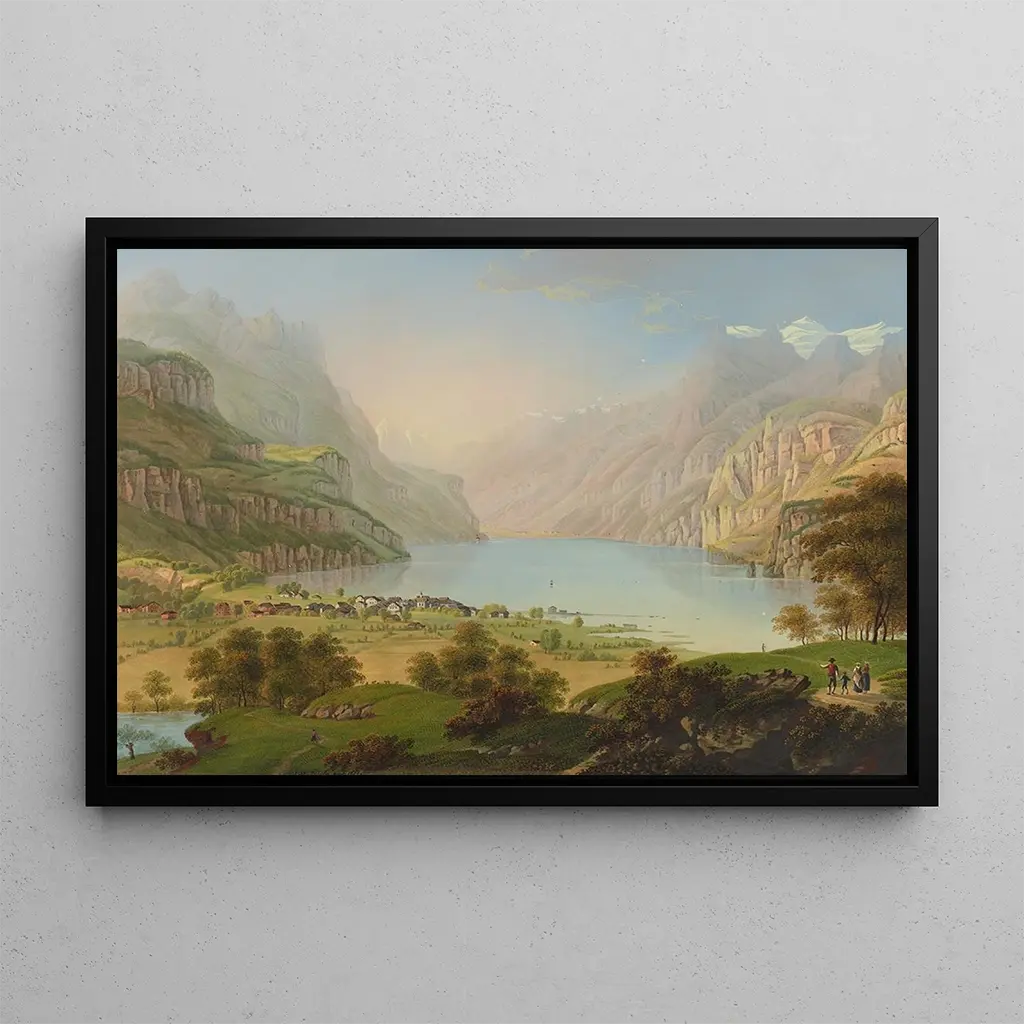 The art print of Fontaine au lac des Quatre-Cantons by Johann Heinrich Bleuler evokes a peaceful and contemplative atmosphere. This painting, bathed in natural light, features breathtaking alpine landscapes where shades of green and blue blend harmoniously. The artist's technique, employing delicate brushstrokes, brings the water's surface to life, creating an almost magical reflection of the surrounding mountains. Each element of the composition invites escape, transporting the viewer to the heart of Swiss nature, where calmness and beauty meet.