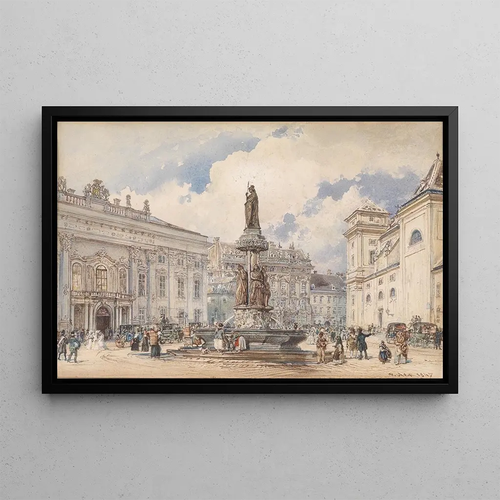 Freyung with the Austria fountain: a scene imbued with serenity This art print of Freyung with the Austria fountain immerses us in a peaceful universe, where nature and architecture meet harmoniously. The soft colors and meticulous details of the canvas evoke an atmosphere of tranquility, inviting the viewer to pause and contemplate the beauty of the landscape. Light plays a crucial role in this work, subtly illuminating the elements of the scene, while the fountain, at the center, draws the eye and symbolizes life. Rudolf von Alt's technique, with its delicate brushstrokes, creates an impression of movement and fluidity, making each element come alive. Rudolf von Alt: a master of Austrian landscape art Rudolf von Alt, born in 1812, is recognized as one of the greatest landscape painters of 19th-century Austria. Influenced by Romanticism and Realism, he captured the beauty of Austrian landscapes with remarkable precision. His career spanned several decades, during which he traveled across Europe, drawing inspiration from the various landscapes he encountered. Alt was also an active member of the Vienna Academy of Fine Arts, contributing to the evolution of landscape art in Austria. His ability to depict light and atmosphere made him an iconic figure of his time. A decorative art print with multiple virtues This reproduction of Freyung with the Austria fountain is ideal for enhancing various spaces in your interior, whether it be a living room, office, or bedroom. Its print quality and fidelity to the original details make this canvas an attractive choice for art enthusiasts. The work adds a touch of serenity and elegance to your decor, while sparking conversations about art and history. By adding this art print to your collection, you give your space a warm and welcoming atmosphere, while paying tribute to a master of Austrian landscape art.