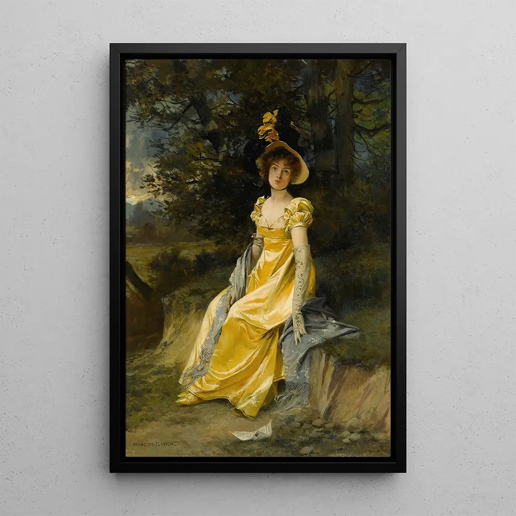 "Waiting" by François Flameng is an art print that evokes melancholy and contemplation. The composition, centered on a female figure, depicts a woman lost in her thoughts, surrounded by a landscape that seems frozen in time. The soft colors and delicate shades create an intimate, almost dreamlike atmosphere. Flameng's technique, blending realism and impressionism, allows viewers to feel the emotion of this suspended moment. Every detail, from the draped fabric of the dress to the subtle expressions on the face, contributes to the depth of this art print, inviting the viewer to share in this poetic pause.