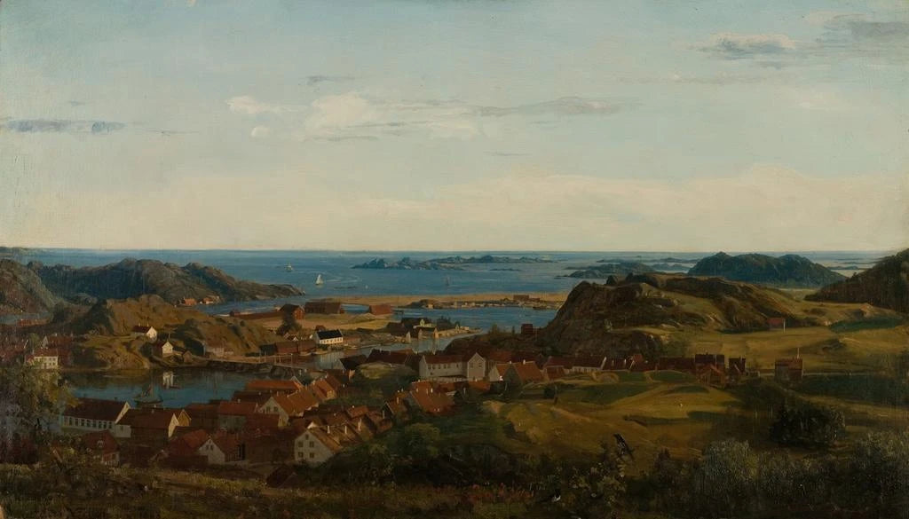 The art print "Since Gjertsbjerg Mandal" by Amaldus Nielsen depicts a serene maritime landscape. The shades of blue and green blend delicately, evoking the gentle atmosphere of a morning by the sea. The meticulous details of the sailboats and coastal houses add a touch of life to this peaceful scene. Light plays a crucial role, illuminating natural and architectural elements, creating an atmosphere that is both calm and inspiring. This piece invites contemplation, transporting the viewer to a place where time seems to stand still.