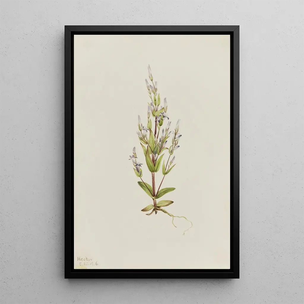 The art print of the Gentian acaule, or Gentiana acuta, immerses us in a captivating floral universe. This work by Mary Vaux Walcott highlights the delicacy of the blue petals, which seem to dance under the mountain light. The shades of blue and green evoke alpine meadows, while the subtle background enhances the splendor of this iconic plant. The watercolor technique, mastered by the artist, captures the transparency and vibrancy of the colors, creating a soothing and contemplative atmosphere. Every detail, from the veins of the leaves to the reflections of light, demonstrates meticulous observation of nature.