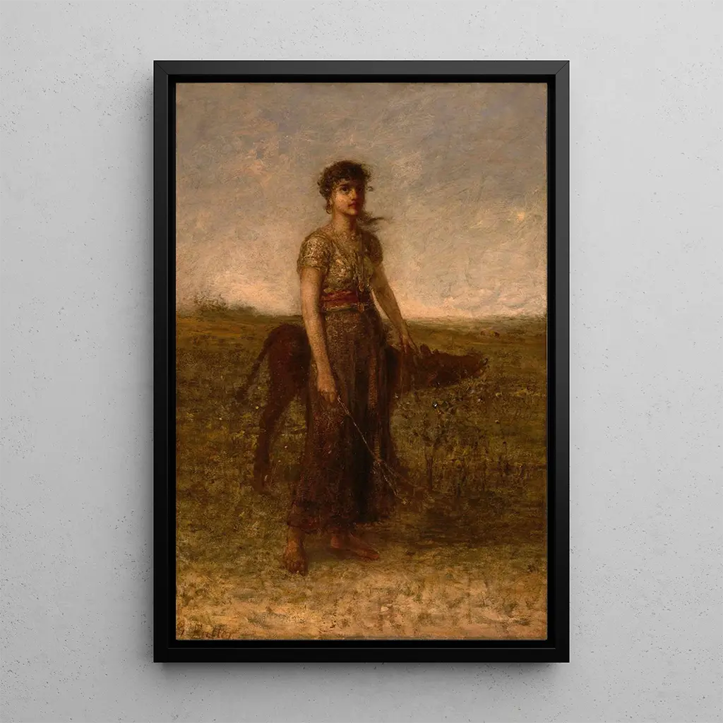 Girl and Calf: A Scene of Rural Tenderness The art print of Girl and Calf by George Fuller captures a delicate moment between a young girl and a calf, evoking the simplicity and beauty of rural life. The soft colors and earth tones blend harmoniously, creating a calming and nostalgic atmosphere. Fuller’s technique, which combines realism and impressionism, allows you to feel the warmth of the sun on the characters’ skin, while the meticulous details of their expressions add an emotional dimension to this scene. This painting, both touching and lively, invites contemplation and escapism into a pastoral world. George Fuller: A Master of American Realism George Fuller, active in the 19th century, is renowned for his works celebrating everyday life and American landscapes. Influenced by the realist movement, he captured moments of simple life with a unique sensitivity. His works, often focused on rural themes, reflect an era when industrialization was beginning to transform the American landscape. Fuller was also a pioneer in the use of light and shadow, which contributed to his success and influence on other artists of his time. His ability to convey emotions through his subjects makes him an important figure in American art. A Decorative Piece with Multiple Assets The art print of Girl and Calf is an ideal decorative piece for various spaces, whether in a living room, office, or bedroom. Its aesthetic appeal and reproduction quality make it a perfect choice to add a touch of softness and serenity to your interior. The fidelity of colors and details allows you to feel the authenticity of the original work, while seamlessly fitting into any type of decor. By choosing this artwork, you opt for a piece that evokes the beauty of nature and emotional bonds, adding a warm dimension to your living space.