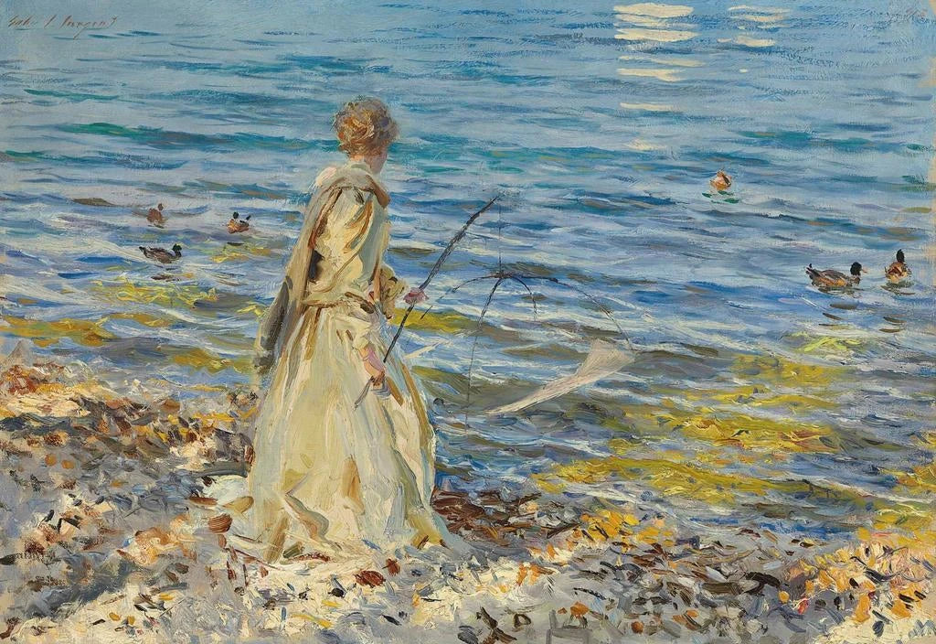 John Singer Sargent, born in 1856, is recognized as one of the greatest portraitists of his time. Trained in Paris, he was influenced by the Impressionists but developed a unique style that combines realism and impressionism. Sargent traveled across Europe and the United States, capturing scenes of everyday life and portraits of influential personalities. Girl Fishing, although less known than his portraits, demonstrates his talent for capturing fleeting moments and the beauty of nature. This artwork showcases his skill in playing with light and shadow, a key characteristic of his work.