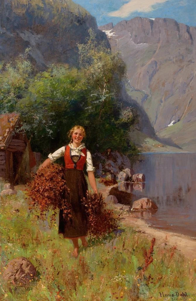 Hans Dahl, né en 1849, est un peintre norvégien reconnu pour ses paysages idylliques et ses scènes de la vie quotidienne. Influencé par le mouvement romantique, il a su capturer l'essence de la nature norvégienne avec une sensibilité unique. Sa carrière s'étend sur la fin du XIXe siècle et le début du XXe siècle, période durant laquelle il a réalisé de nombreuses œuvres qui sont aujourd'hui considérées comme emblématiques de l'art scandinave. Dahl a également été influencé par ses voyages en Europe, intégrant des éléments de différents styles dans son travail. Sa capacité à évoquer des émotions à travers des paysages naturels a fait de lui une figure importante de l'art nordique.