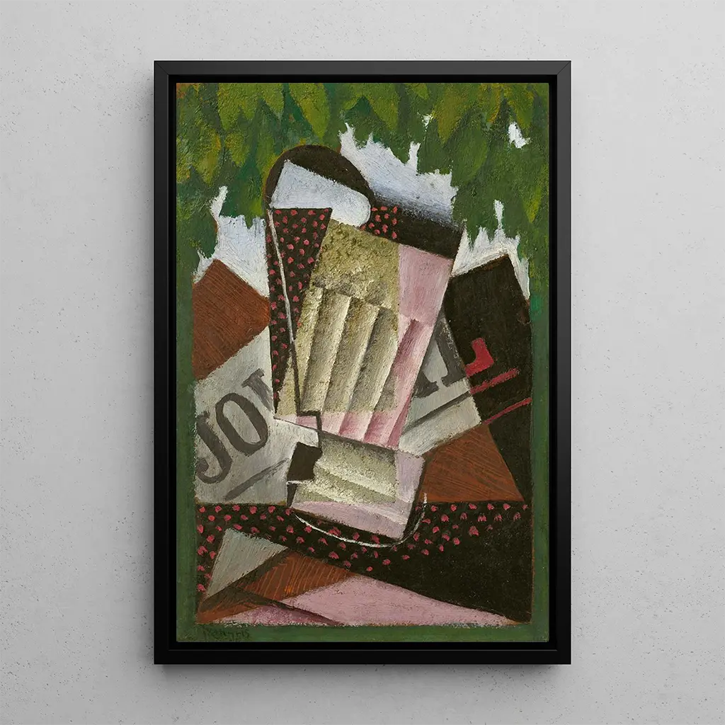 Juan Gris, figure majeure du cubisme, a su transformer la perception de la nature morte à travers son art. Né à Madrid, il s'installe à Paris où il rencontre des artistes influents qui façonneront son style. Sa capacité à synthétiser les influences du cubisme tout en ajoutant sa propre touche personnelle lui a permis de se démarquer. "Verre, journal et feuillage" illustre parfaitement son approche innovante, mêlant abstraction et représentation, et témoignant de son rôle essentiel dans l'évolution de l'art moderne au début du XXe siècle.