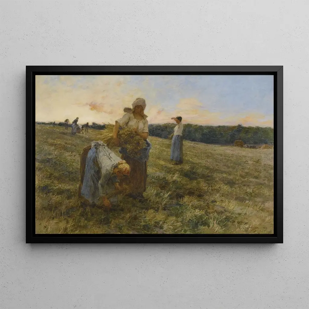 In "Harvesters in the Evening," Léon Augustin Lhermitte transports us to the heart of a bucolic scene where women, bent under the weight of their labor, gather the wheat ears left by the harvest. The warm color palette, dominated by golden and earthy tones, evokes the softness of twilight. Lhermitte's technique, blending realism and impressionism, gives this artwork a peaceful and contemplative atmosphere. The meticulous details of the faces and clothing of the harvesters reflect a deep respect for peasant life, while the gentle evening light envelops the scene with an almost magical aura.