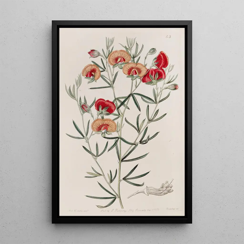 Gompholobium changeant : a captivating floral symphony The art print of Gompholobium changeant transports us to a lush garden, where warm shades of orange and red intertwine gracefully. This piece, created with remarkable precision, captures the very essence of this unique plant. The delicate shapes and refined details of the flowers evoke an atmosphere of joy and vitality. Every element of the composition seems to vibrate, inviting the viewer to appreciate the fleeting beauty of nature. The technique used by the artist gives this canvas depth and visual richness that are sure to appeal to art enthusiasts. Sydenham Edwards: a master of botanical art Sydenham Edwards, an iconic figure in botanical illustration in the early 19th century, skillfully combined science and art. His works, including Gompholobium changeant, reflect his commitment to faithful plant representation while incorporating an aesthetic dimension. Influenced by the botanical advances of his time, Edwards collaborated with botanists to document flora artistically. His style, characterized by meticulous attention to detail, has left a lasting mark in the world of botanical art, making him a pioneer whose legacy endures. A decorative acquisition with multiple benefits Choosing an art print of Gompholobium changeant means selecting a canvas that will enrich your living space. Whether in a living room, office, or bedroom, this piece adds a touch of color and freshness. Its printing quality ensures remarkable fidelity to the nuances and details of the original, creating a captivating focal point in your decor. By integrating this art print into your interior, you invite the beauty of nature to flourish in your home, while celebrating the talent of an artist who immortalized floral splendor.
