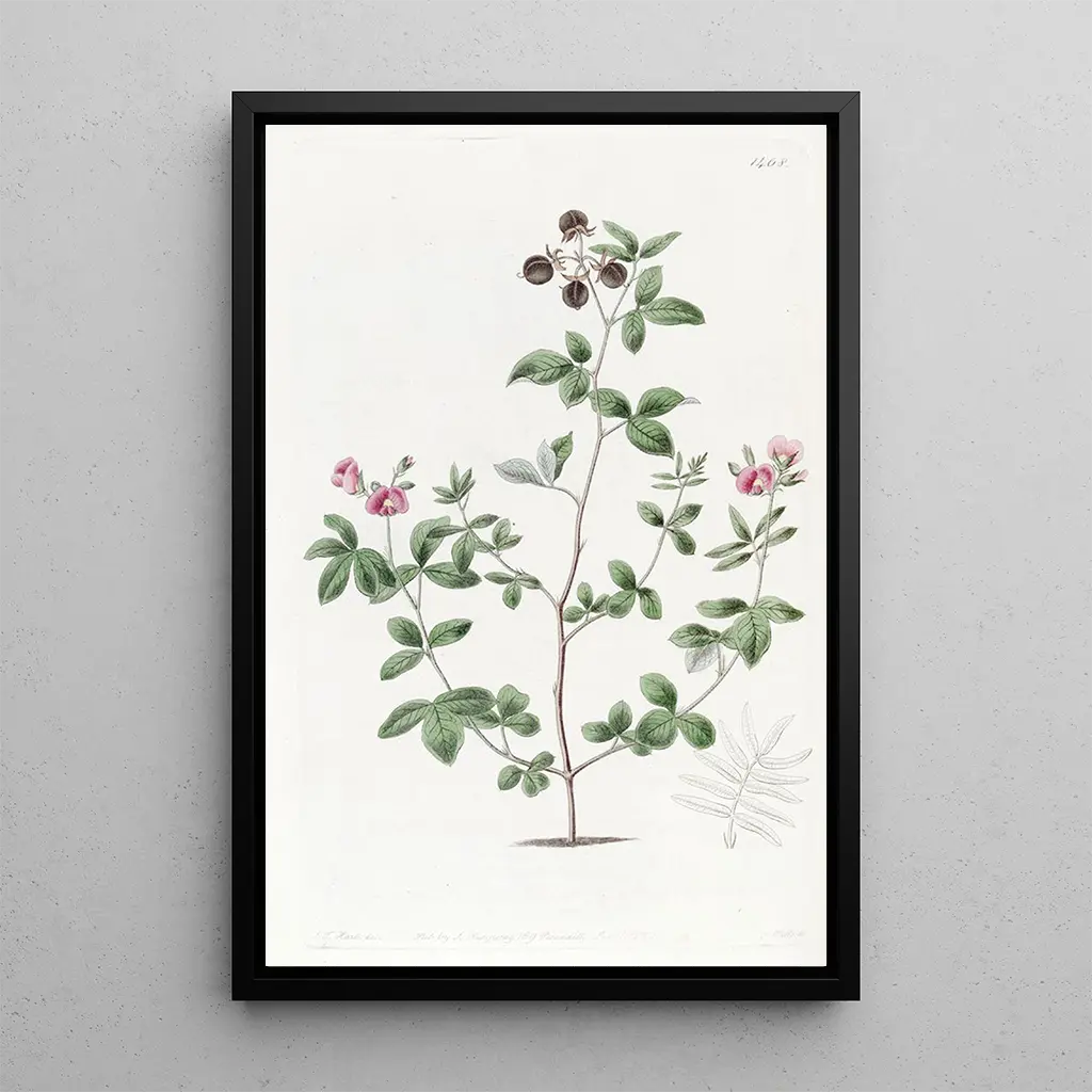 The art print of Gompholobium by M. Knight transports us to a world where floral diversity is showcased with brilliance. The delicate shades of pink and purple intertwine with nuances of green, creating a harmonious and lively tableau. The watercolor technique, used with finesse, imparts a sense of lightness and fluidity, as if the flowers are in motion. Every detail is carefully rendered, inviting the viewer to explore the subtle beauty of this unique plant, while evoking a feeling of serenity and wonder.