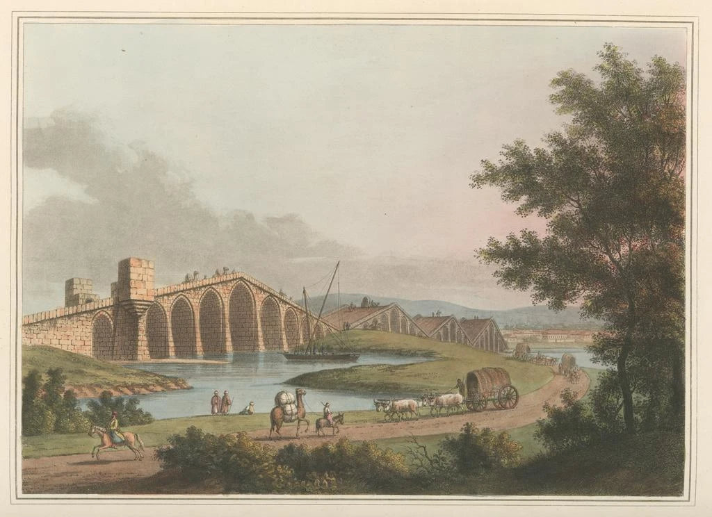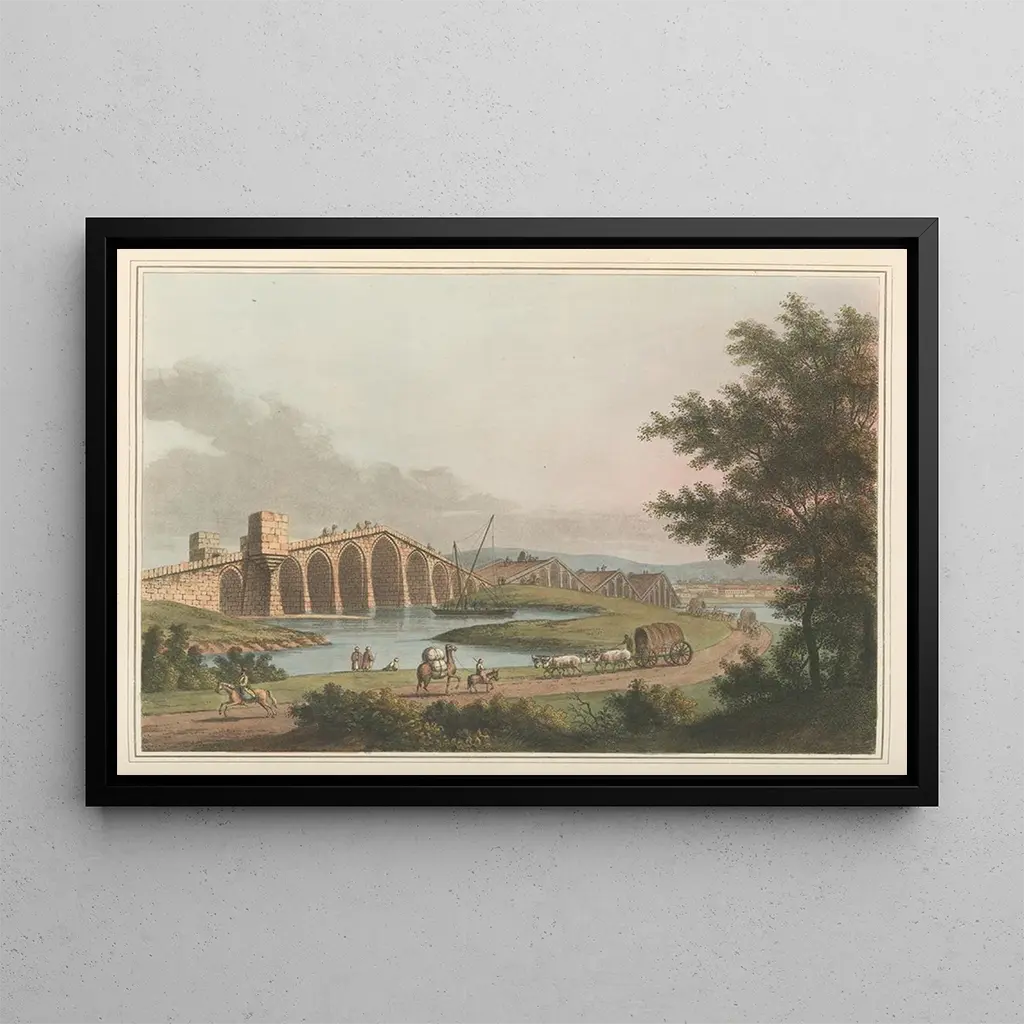 The art print of Luigi Mayer's Grand pont transports us to a universe where architecture blends with nature. The delicate shades of blue and green, combined with touches of golden light, create an atmosphere that is both serene and grandiose. The oil painting technique used by Mayer allows for precise rendering of the structures' details, while infusing a certain poetry into the scene. This art print invites contemplation, where each element seems to tell a story, and where the bridge becomes a symbol of passage between two worlds.