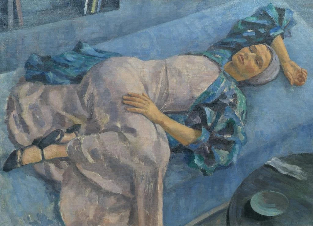 Grete Gamerith on a Blue Sofa: a moment of serenity captured