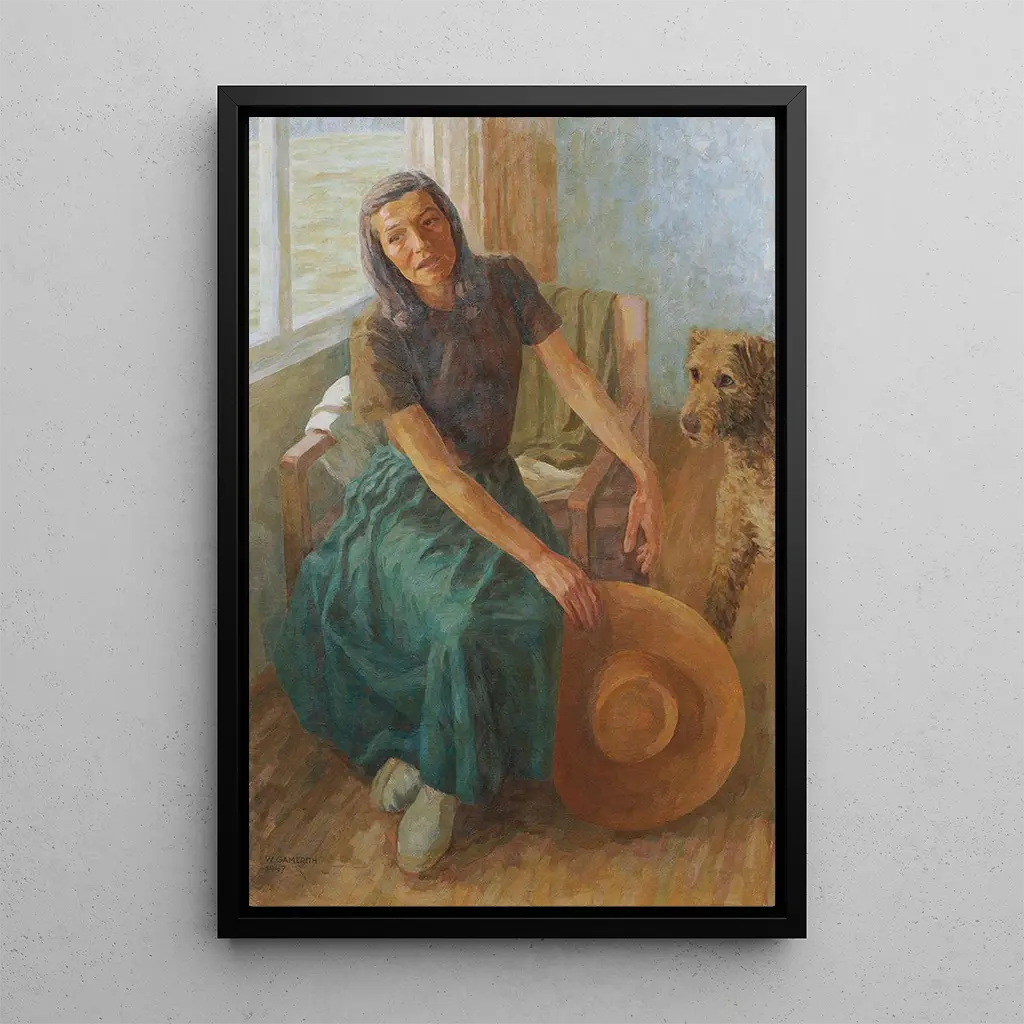 The art print "Grete Gamerith with the dog Puck" by Walther Gamerith is a touching depiction of affection between a woman and her four-legged companion. The vivid colors and meticulous details of the scene evoke an atmosphere of warmth and conviviality. The oil on canvas technique allows the artist to play with light and shadow, emphasizing Grete's gentle features and Puck's liveliness. This art print captures a simple moment of happiness, inviting the viewer to feel the joy and complicity emanating from this relationship.